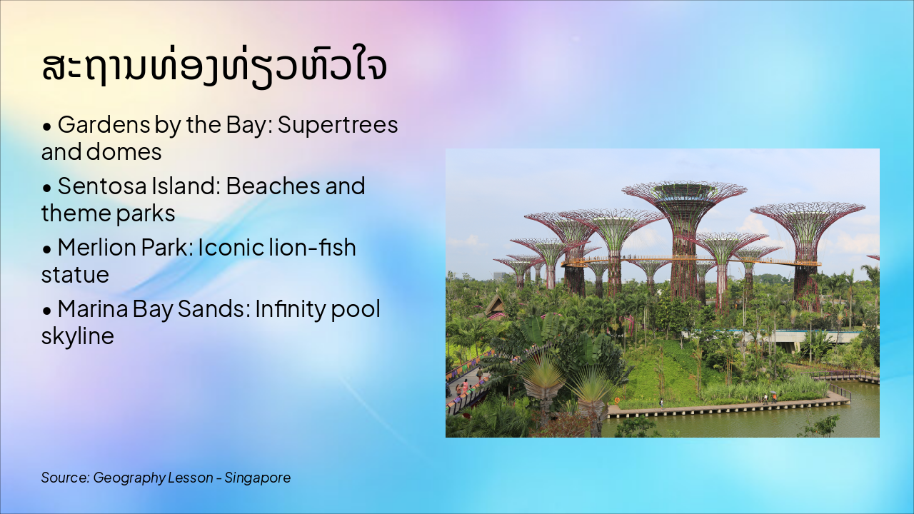 ອອກແບບພຣະສະເນທີໃໝ່ສໍາລັບວິຊາພູມສາດ ບົດທີ 14 ປະເທດສິງກະໂປ, ໃຫ້ມີການຈັດຮູບແບບທັນສະໄໝ, ມີຮູບພາບປະກອບ ແລະສີສັນສົດໃສ. ມີຫົວຂໍ້ຫຼັກ: 1) ພູມສາດທໍາມະຊາດ (ທີ່ຕັ້ງ, ພູມອາກາດ, ຊັບພະຍາກອນ), 2) ພູມສາດສັງຄົມ (ປະຊາກອນ, ສາສະໜາ, ວັດທະນະທຳ), 3) ສັນຍະລັກປະເທດ (ທຸງ, ດອກໄມ້, ສັດປະຈຳຊາດ), 4) ແຫຼ່ງທ່ອງທ່ຽວສໍາຄັນ. ສຸດທ້າຍເພີ່ມສະຫຼຸບແລະຄໍາຖາມທົດສອບ.