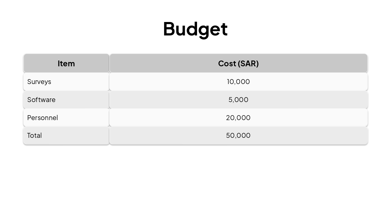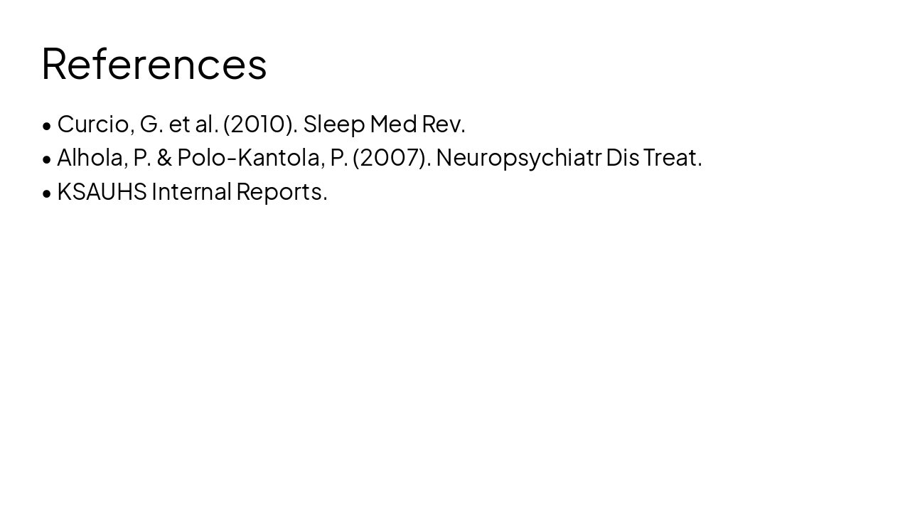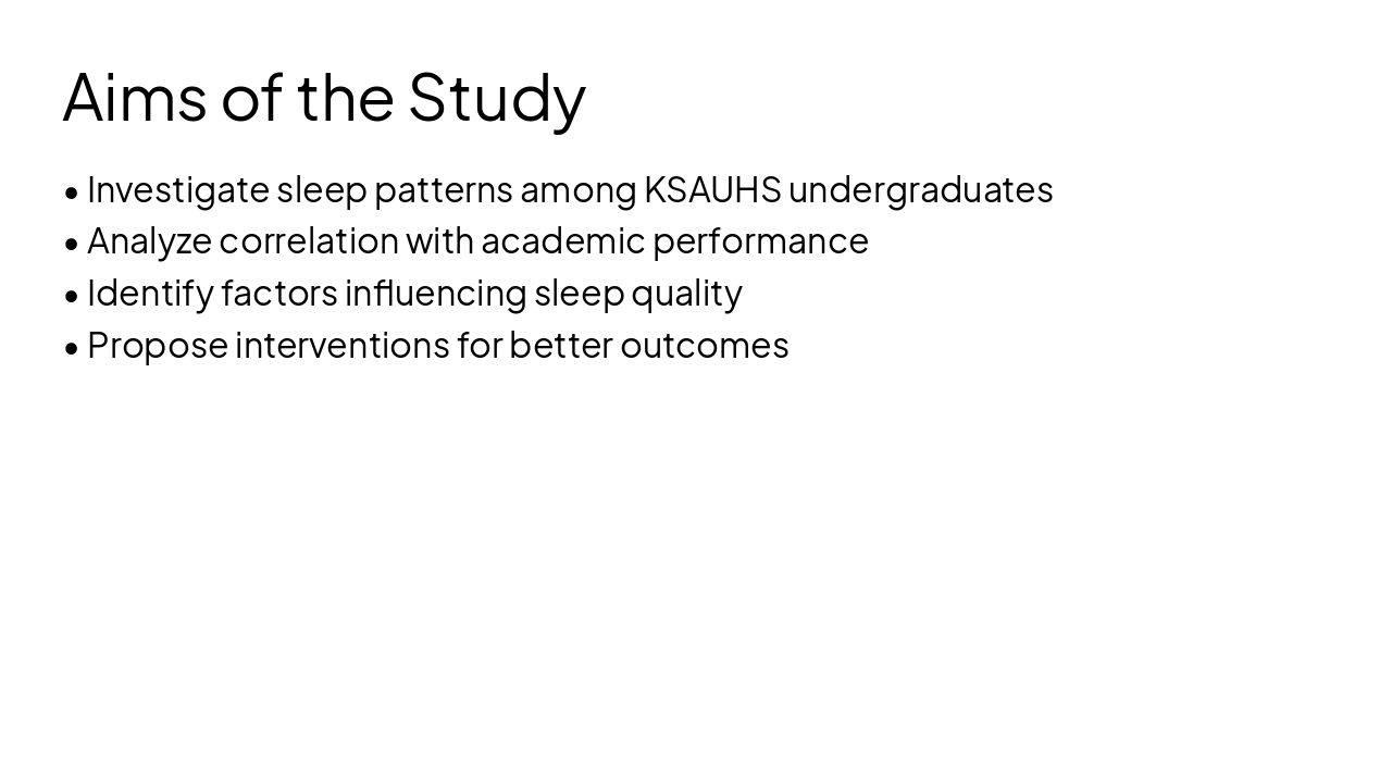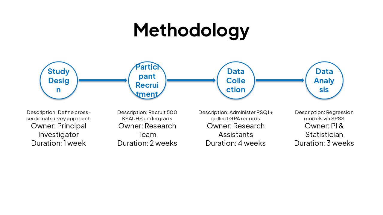 { "headers": [ "Phase", "Description", "Owner", "Duration" ], "rows": [ [ "Study Design", "Define cross-sectional survey approach", "Principal Investigator", "1 week" ], [ "Participant Recruitment", "Recruit 500 KSAUHS undergrads", "Research Team", "2 weeks" ], [ "Data Collection", "Administer PSQI + collect GPA records", "Research Assistants", "4 weeks" ], [ "Data Analysis", "Regression models via SPSS", "PI & Statistician", "3 weeks" ] ] }