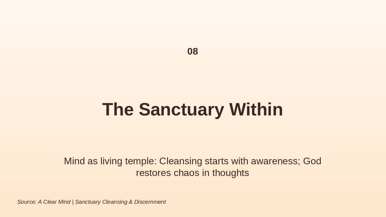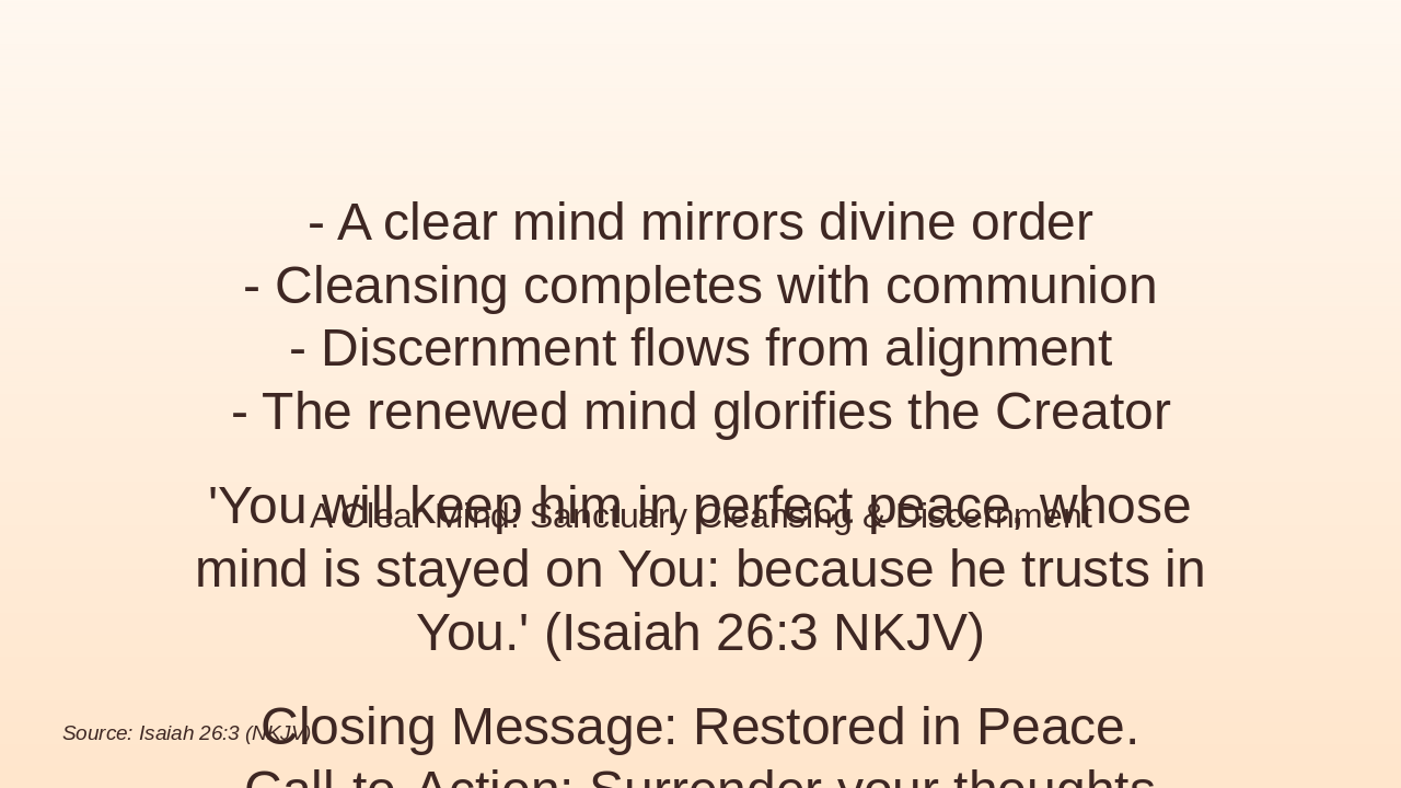 The slide "Sanctuary Restored" emphasizes that a clear mind reflects divine order, with cleansing achieved through communion, leading to discernment and glorification of the Creator. It quotes Isaiah 26:3 on perfect peace through trust in God, ending with a call to surrender thoughts for divine clarity and communion.