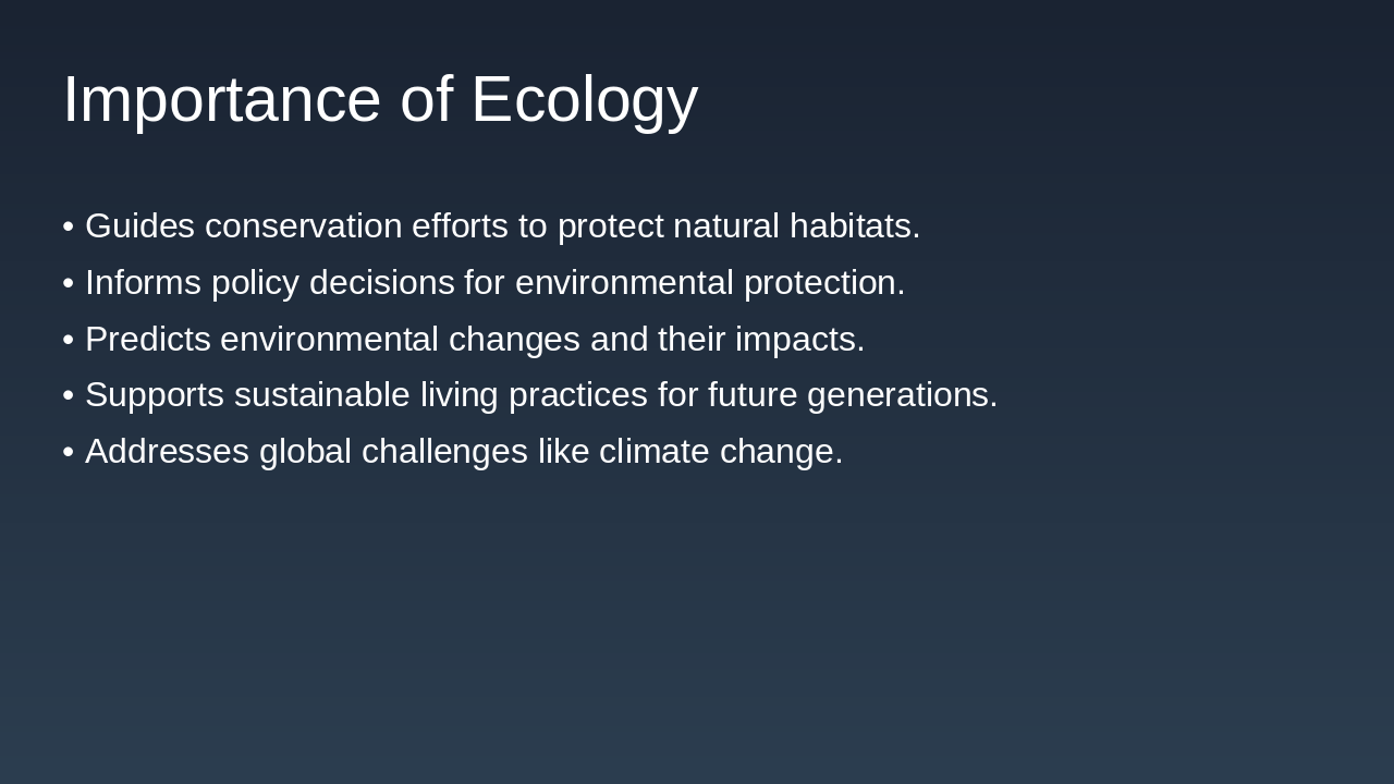 Ecology plays a vital role in guiding conservation efforts to safeguard natural habitats and informing policy decisions for environmental protection. It also enables predictions of environmental changes, supports sustainable living for future generations, and tackles global issues like climate change.