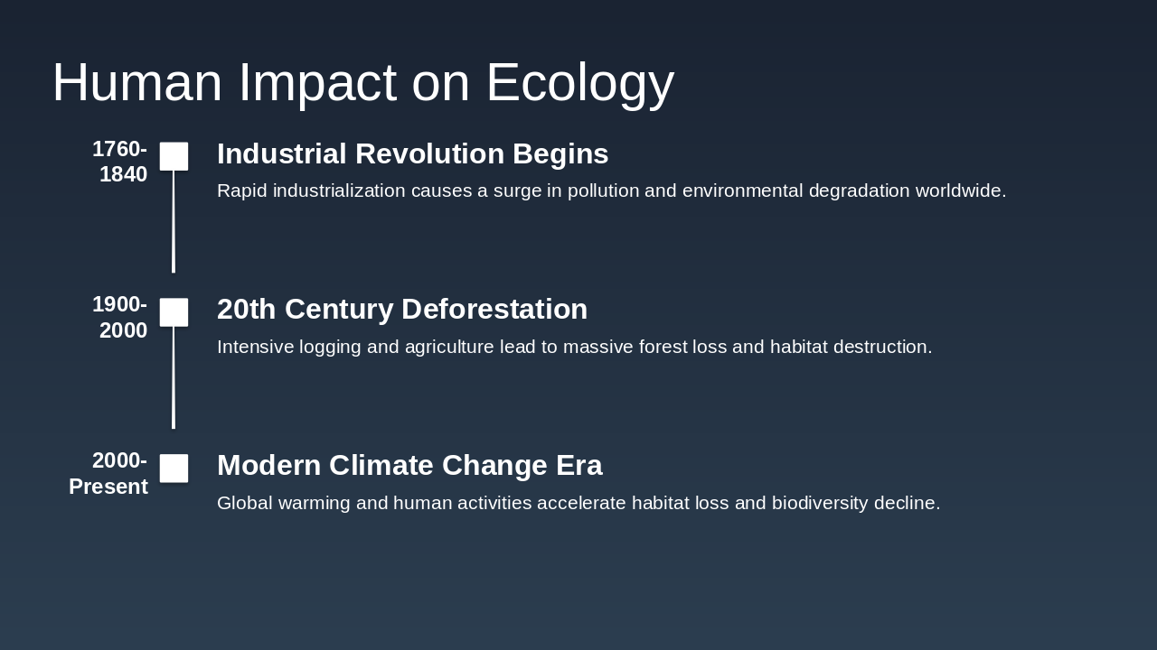 1760-1840: Industrial Revolution Begins Rapid industrialization causes a surge in pollution and environmental degradation worldwide. 1900-2000: 20th Century Deforestation Intensive logging and agriculture lead to massive forest loss and habitat destruction. 2000-Present: Modern Climate Change Era Global warming and human activities accelerate habitat loss and biodiversity decline.