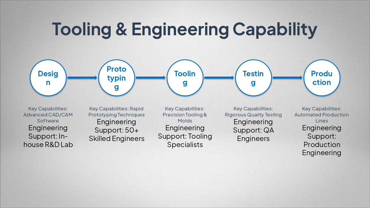 { "headers": [ "Phase", "Key Capabilities", "Engineering Support" ], "rows": [ [ "Design", "Advanced CAD/CAM Software", "In-house R&D Lab" ], [ "Prototyping", "Rapid Prototyping Techniques", "50+ Skilled Engineers" ], [ "Tooling", "Precision Tooling & Molds", "Tooling Specialists" ], [ "Testing", "Rigorous Quality Testing", "QA Engineers" ], [ "Production", "Automated Production Lines", "Production Engineering" ] ] }