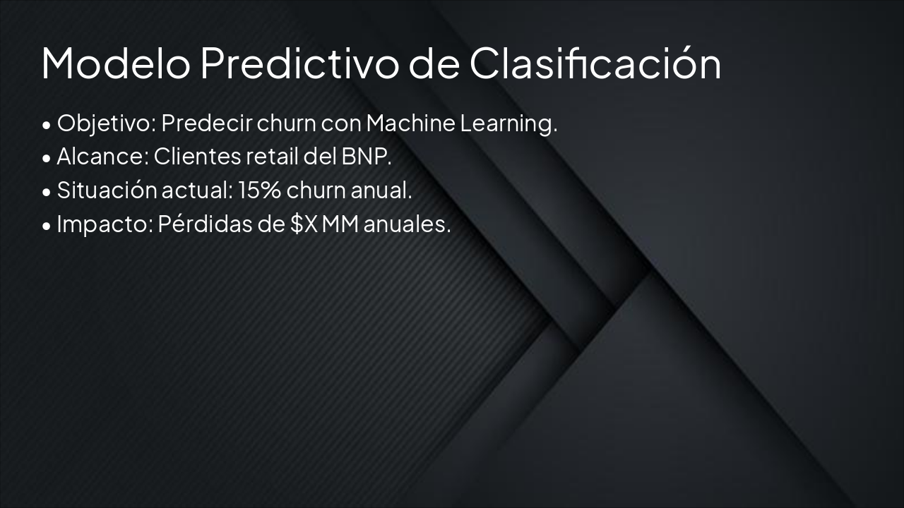 Esta diapositiva presenta un modelo predictivo de clasificación de clientes enfocado en el análisis de churn. El subtítulo destaca estrategias y técnicas para retener clientes.