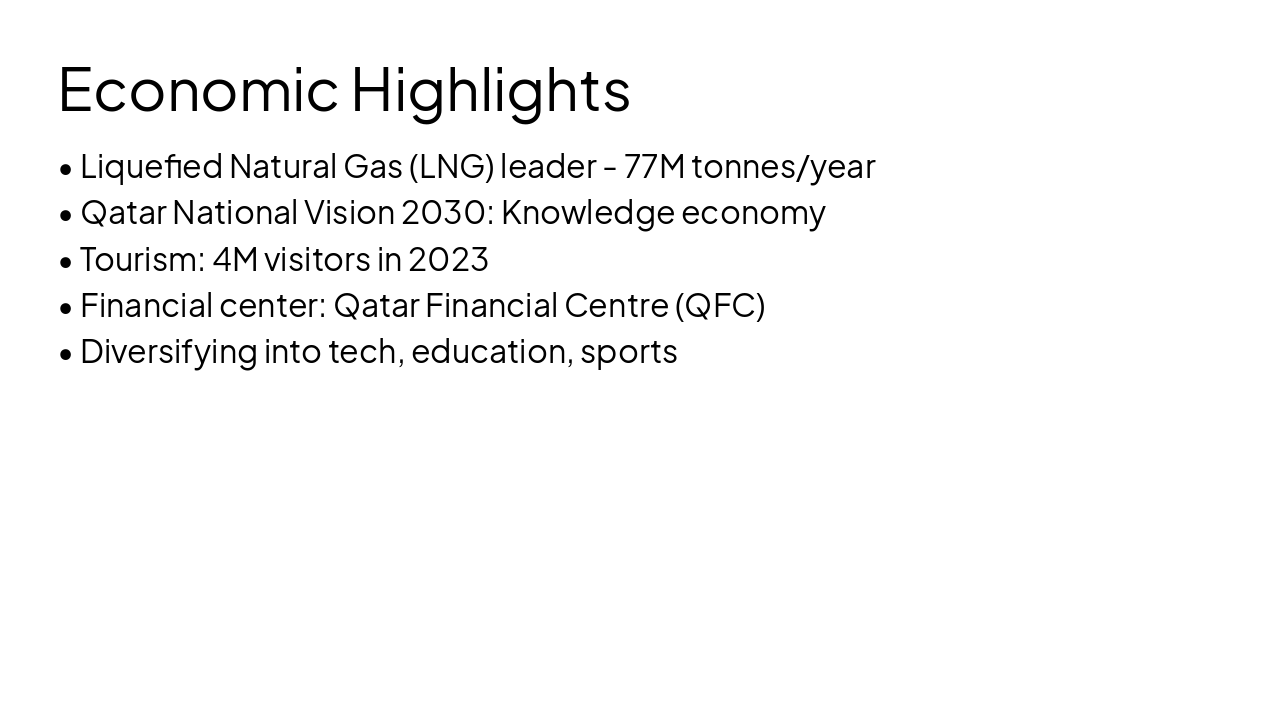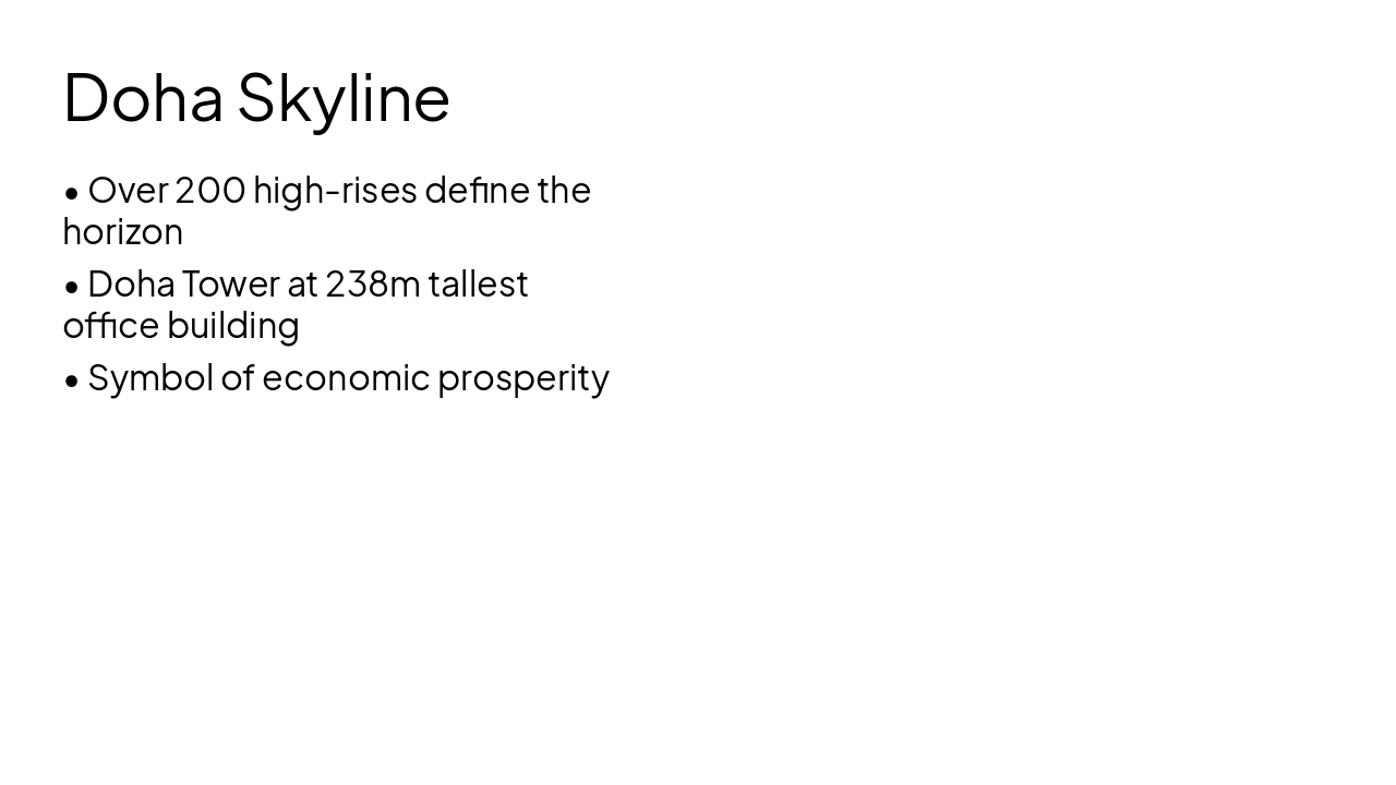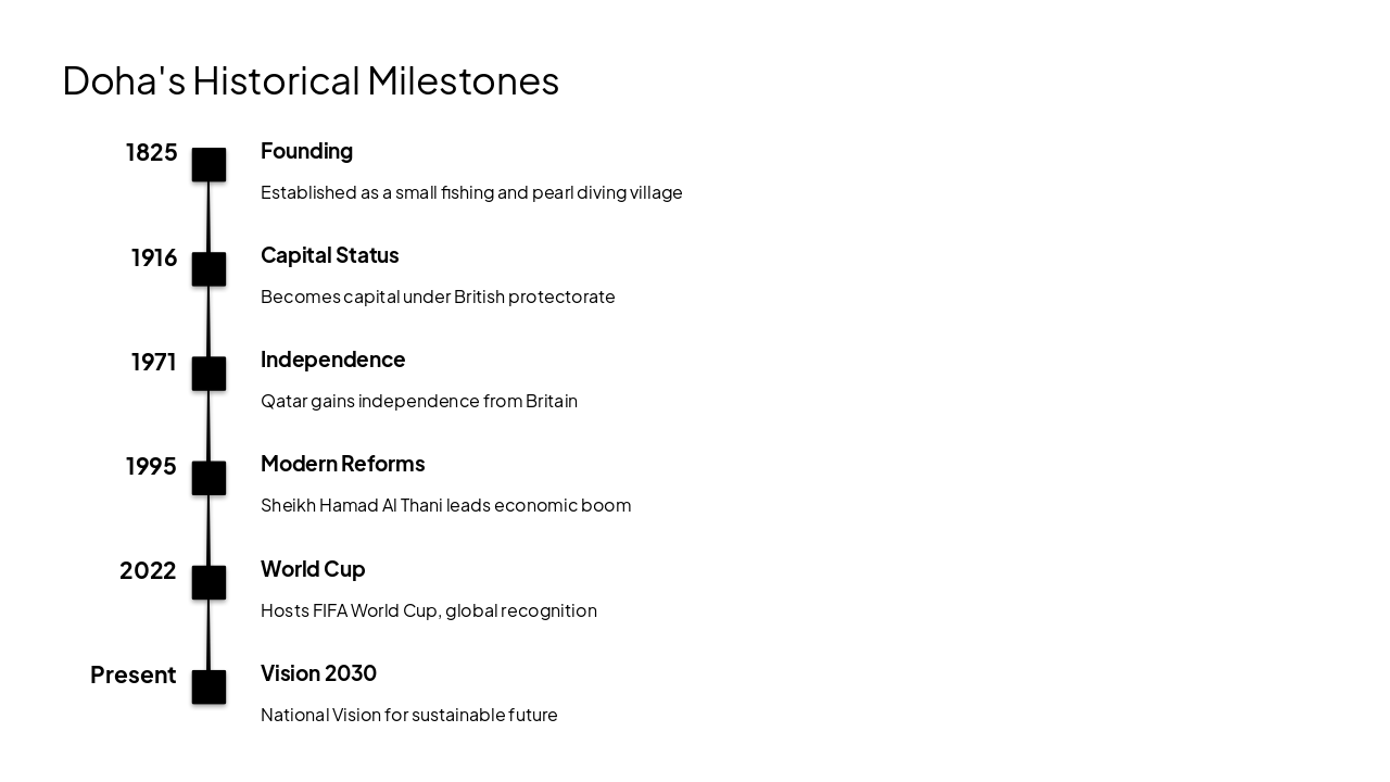 1825: Founding Established as a small fishing and pearl diving village 1916: Capital Status Becomes capital under British protectorate 1971: Independence Qatar gains independence from Britain 1995: Modern Reforms Sheikh Hamad Al Thani leads economic boom 2022: World Cup Hosts FIFA World Cup, global recognition Present: Vision 2030 National Vision for sustainable future