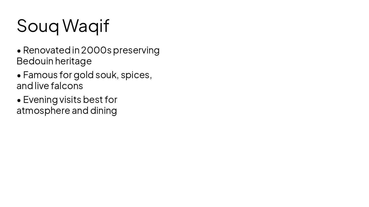 🕌 Souq Waqif Bustling traditional market with spices, textiles, and falcons