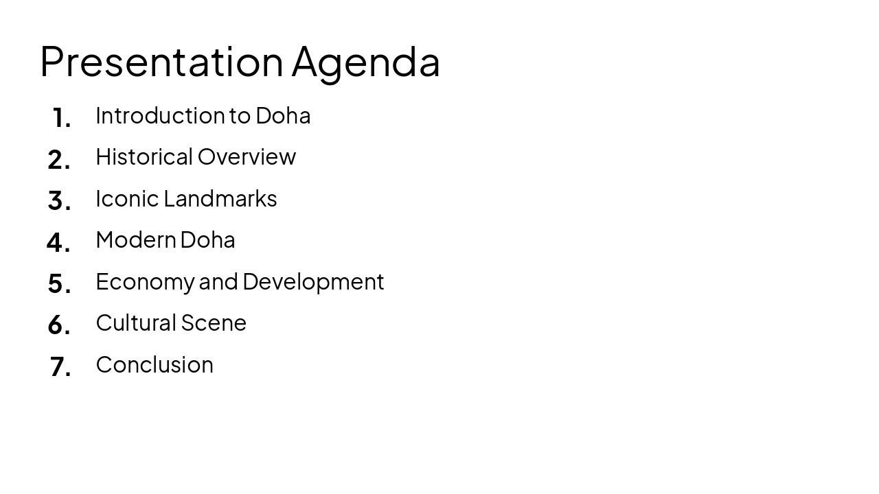 This presentation showcases Doha, Qatar's vibrant capital, blending tradition and modernity. It covers key statistics, historical milestones from fishing village to global city, iconic landmarks like Souq Waqif and Museum of Islamic Art, modern skysc