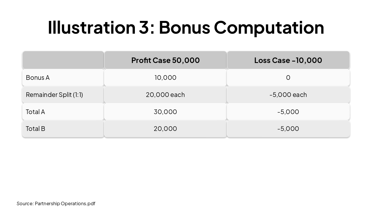 Create a comprehensive presentation titled "Chapter 12: Partnership Operations" based entirely on the uploaded document "Partnership Operations.pdf" (15 pages). Structure: 1. Title Slide – Chapter 12: Partnership Operations 2. Learning Objectives (as shown on page 1) 3. Concept Overview – Division of Profits and Losses - Rules under Art. 1797 of the Philippine Civil Code - Industrial vs Capitalist Partner definitions 4. Partnership Agreements – Key Provisions - Salaries - Bonuses - Interest on Capital Contributions - Order of Allocation Include ALL Illustrations exactly as shown in the document. For each Illustration (1 to 9): - Create separate slides per case (Case 1, Case 2, etc.) - Snip and insert the original illustration tables/calculation layouts as images for clarity (use the scanned visuals per page). - Add a short discussion slide before each illustration explaining the concept involved. Illustrations to include: - Illustration 1: Salaries (Case 1 and Case 2) - Illustration 2: No P/L Ratio - Illustration 3: Bonus (Profit and Loss cases) - Illustration 4: Bonus with limit - Illustration 5: Interest on Capital (weighted average computation) - Illustration 6: Profit after salaries (salaries recognized as expenses) - Illustration 7: Reconstruction of information (T-account squeeze method) - Illustration 8: Reconstruction (Pro forma method) - Illustration 9: P/L ratio in fractions End with: - Chapter Summary (page 15 content) Ensure calculations and tables match the document exactly. Keep layout clean and academic. Use clear section dividers for each Illustration.