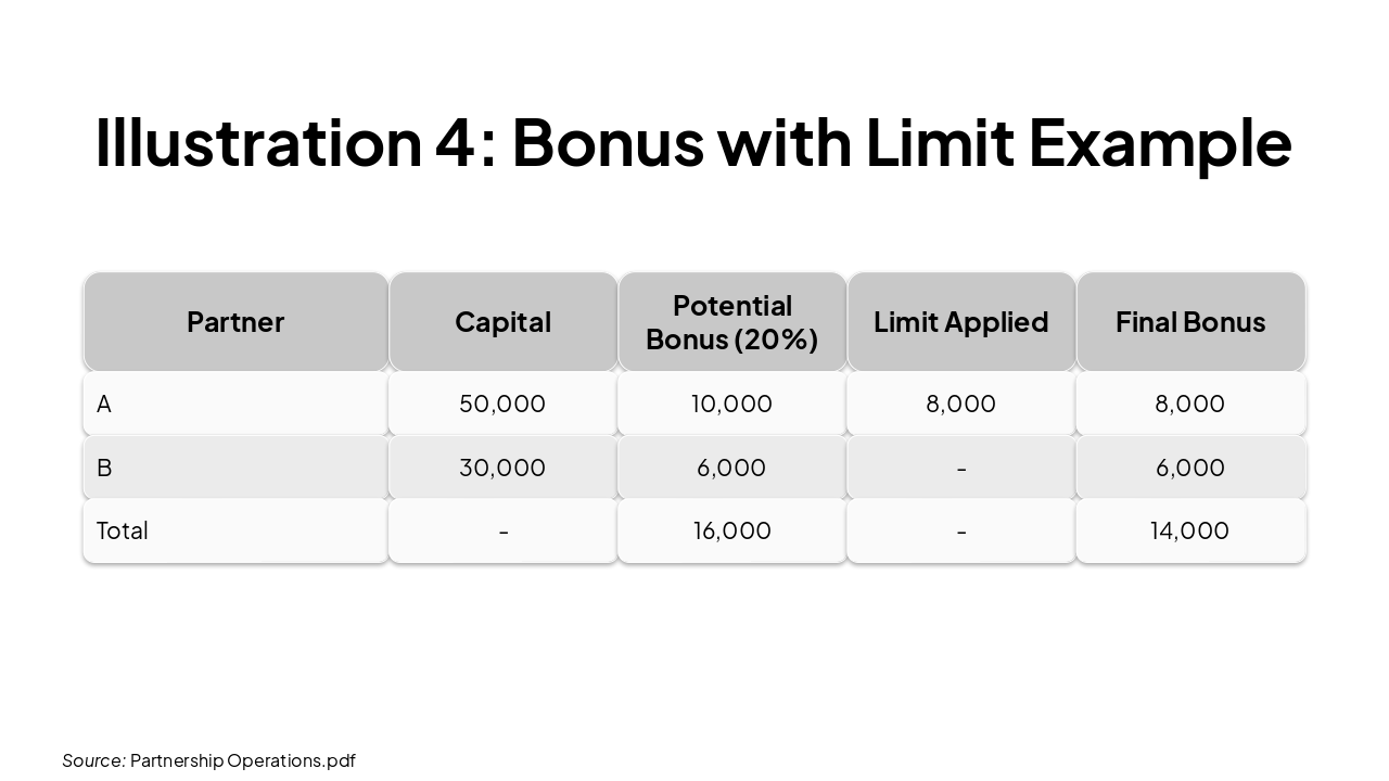 | Partner | Capital | Potential Bonus (20%) | Limit Applied | Final Bonus |