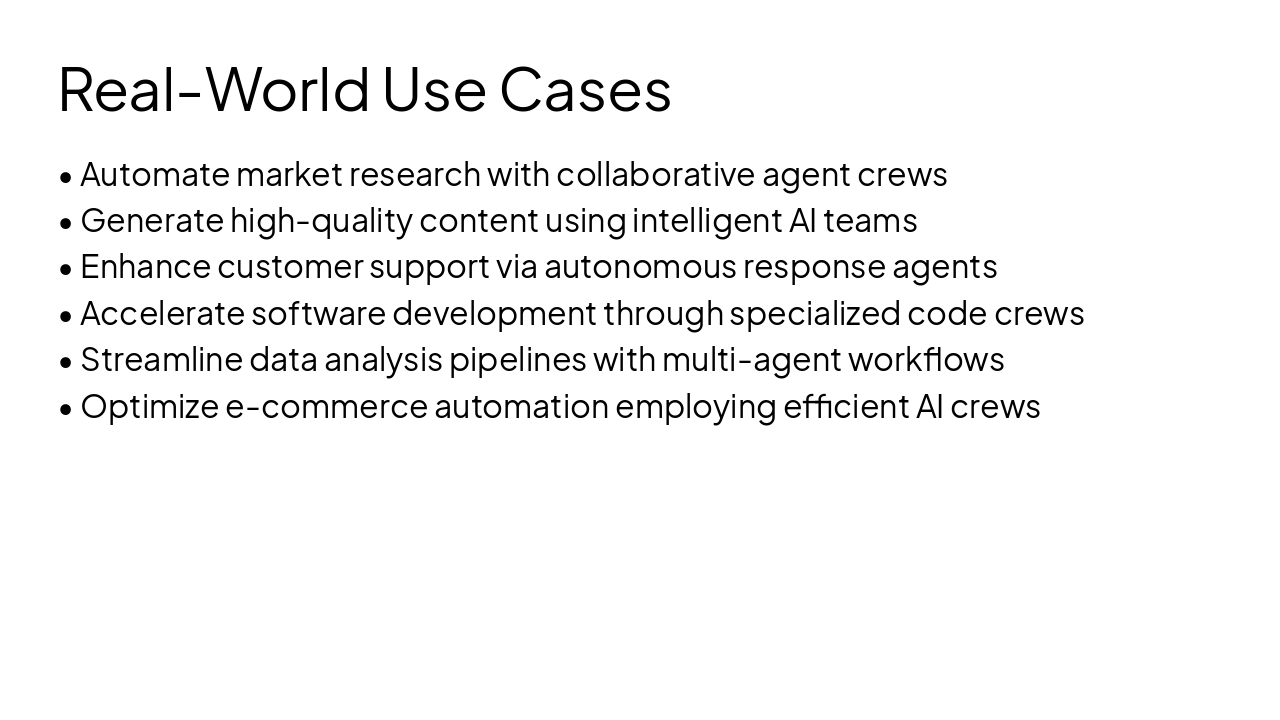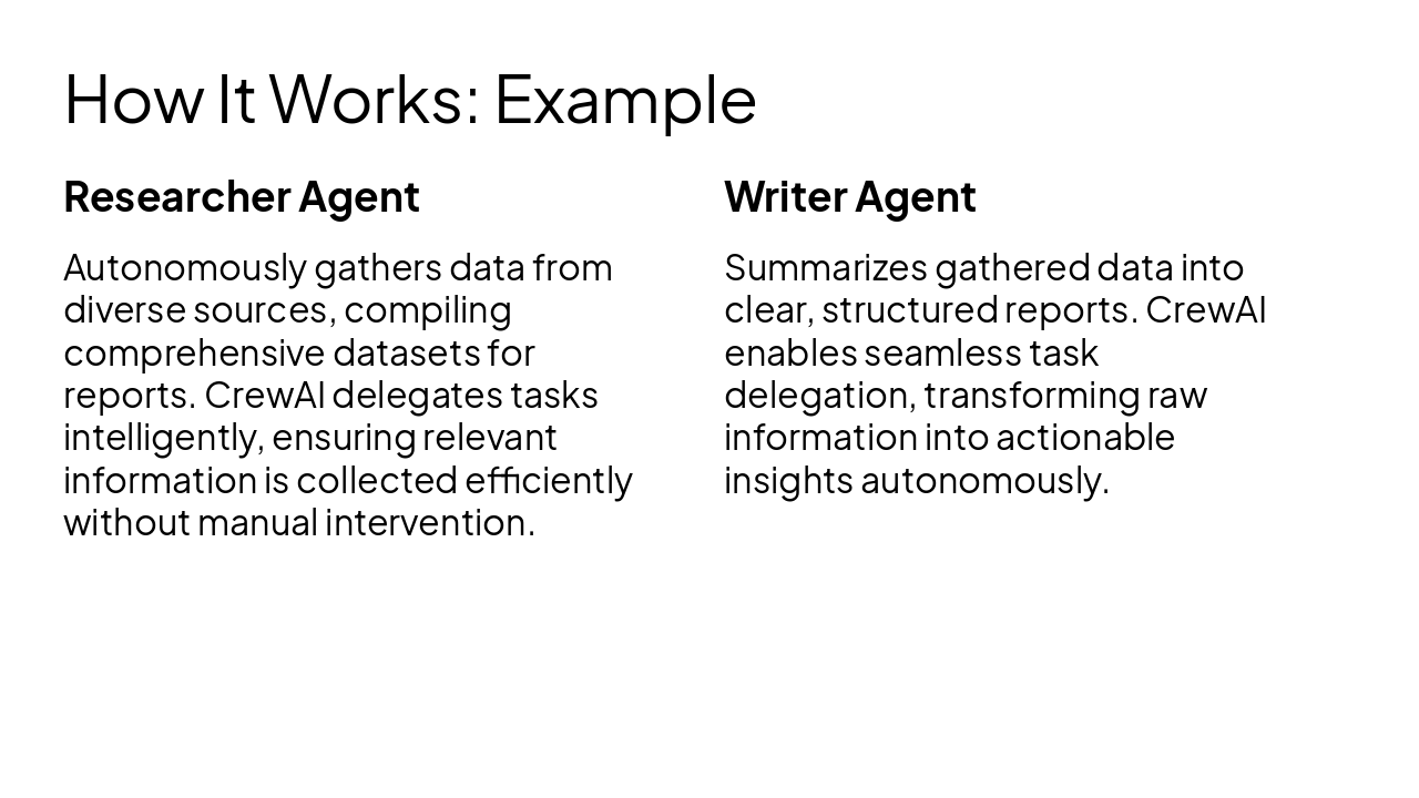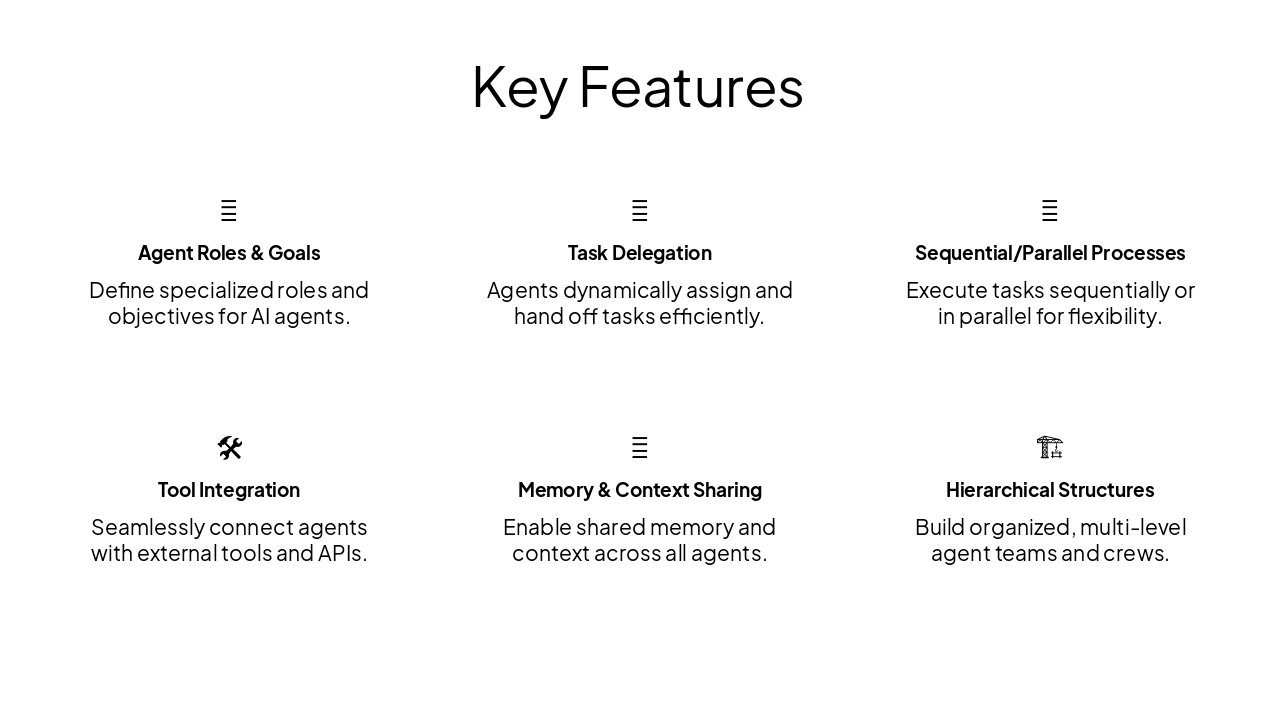 { "headers": [ "Phase", "Description", "Output" ], "rows": [ [ "Define Agents", "Specify roles, goals, and tools for agents", "Configured Agents" ], [ "Create Tasks", "Define tasks with descriptions, agents, and expected outputs", "Defined Tasks" ], [ "Assemble Crew", "Combine agents and tasks into a crew with process", "Crew Object" ], [ "Kickoff Execution", "Initiate crew execution to generate results", "Final Results" ] ] }