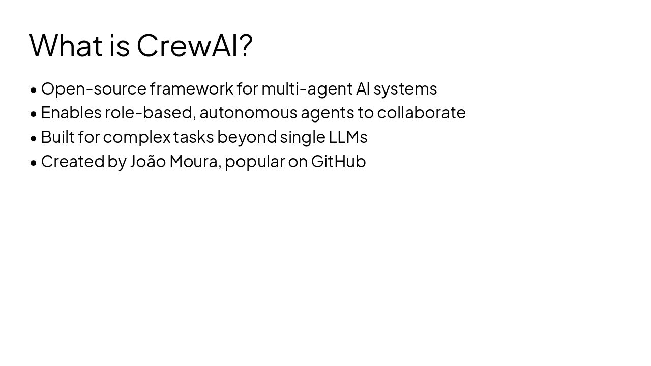 The CrewAI Architecture workflow slide outlines four sequential phases: defining agents with roles, goals, and tools; creating tasks with descriptions, agents, and expected outputs; assembling a crew by combining them with a process; and kicking off execution. Each phase yields a specific output, progressing from configured agents and defined tasks to a crew object and final results.