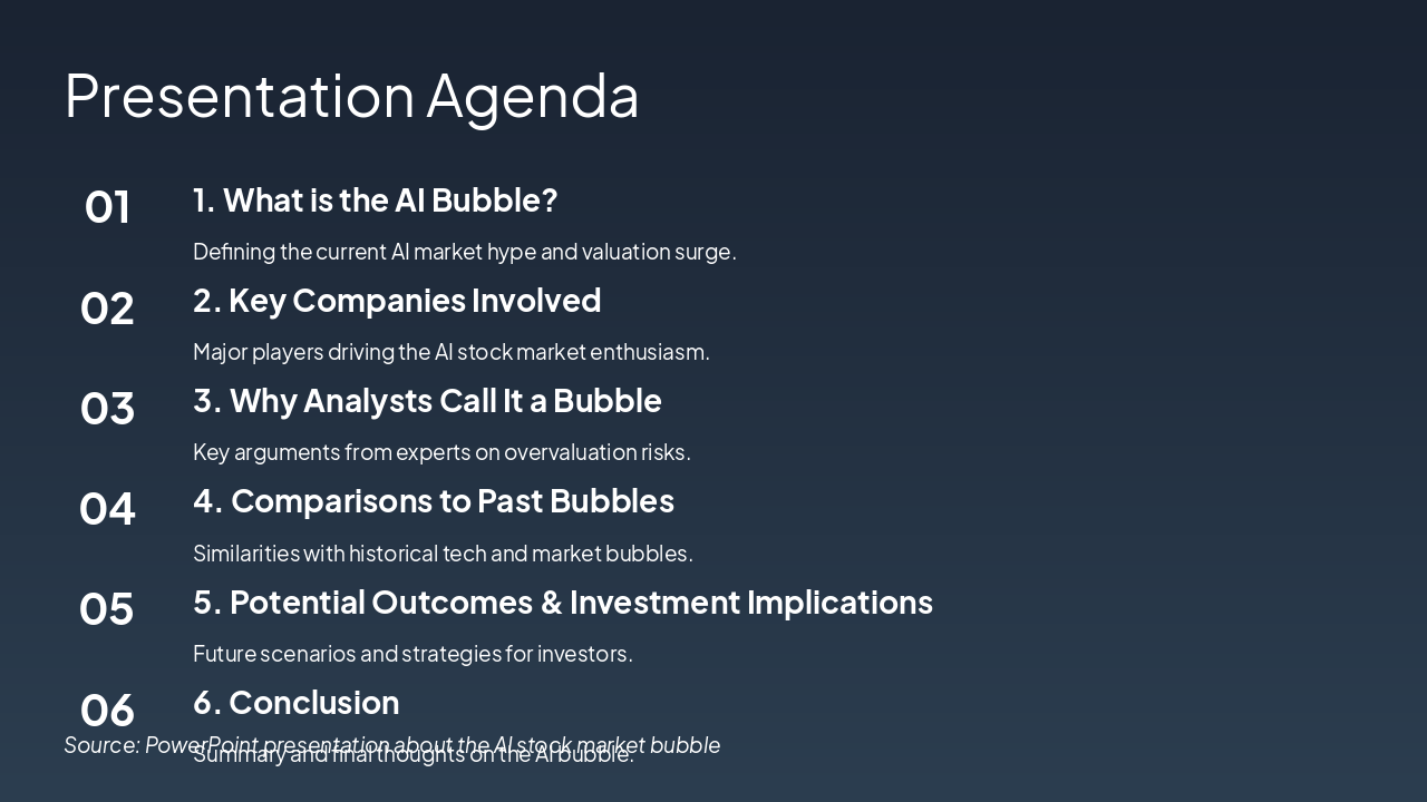 This agenda outlines a presentation on the AI bubble, starting with its definition and the key companies fueling market hype. It then covers analysts' overvaluation concerns, historical comparisons, potential outcomes for investors, and a concluding summary.