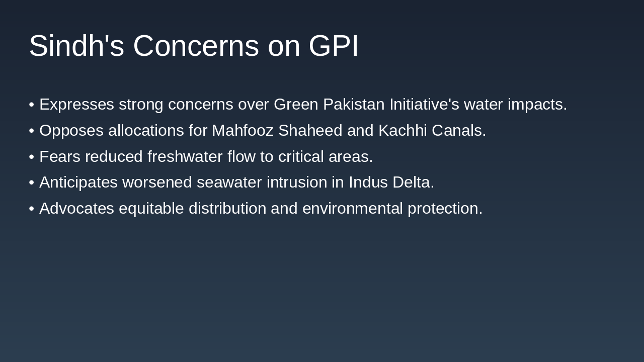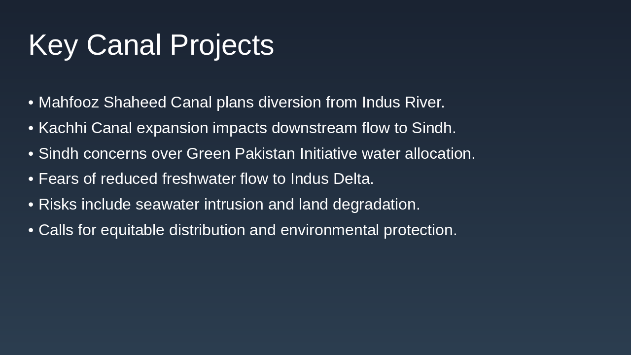 Sindh expresses concerns over water allocation for projects like Mahfooz Shaheed Canal and Kachhi Canal, fearing reduced freshwater flow, seawater intrusion, and land degradation in the Indus Delta. Calls for equitable distribution to protect environment and agriculture.