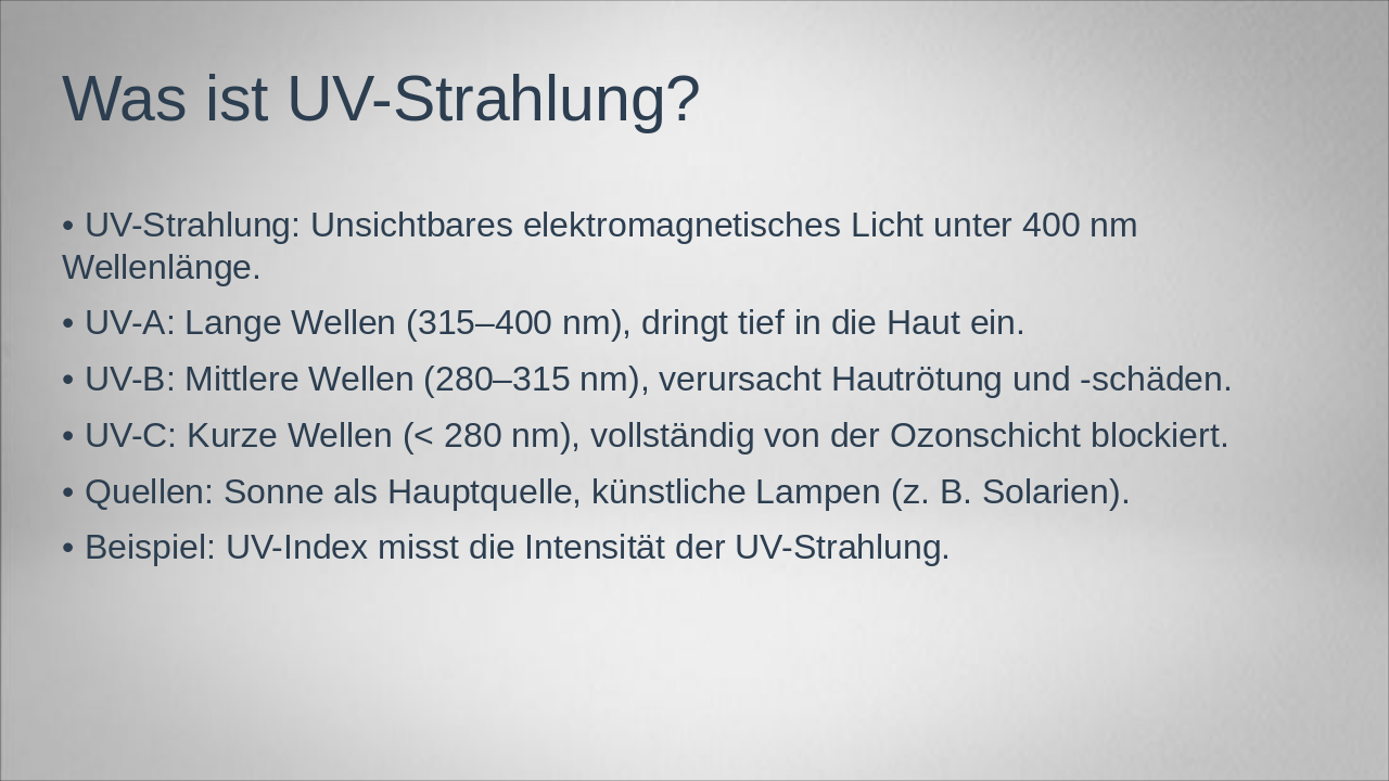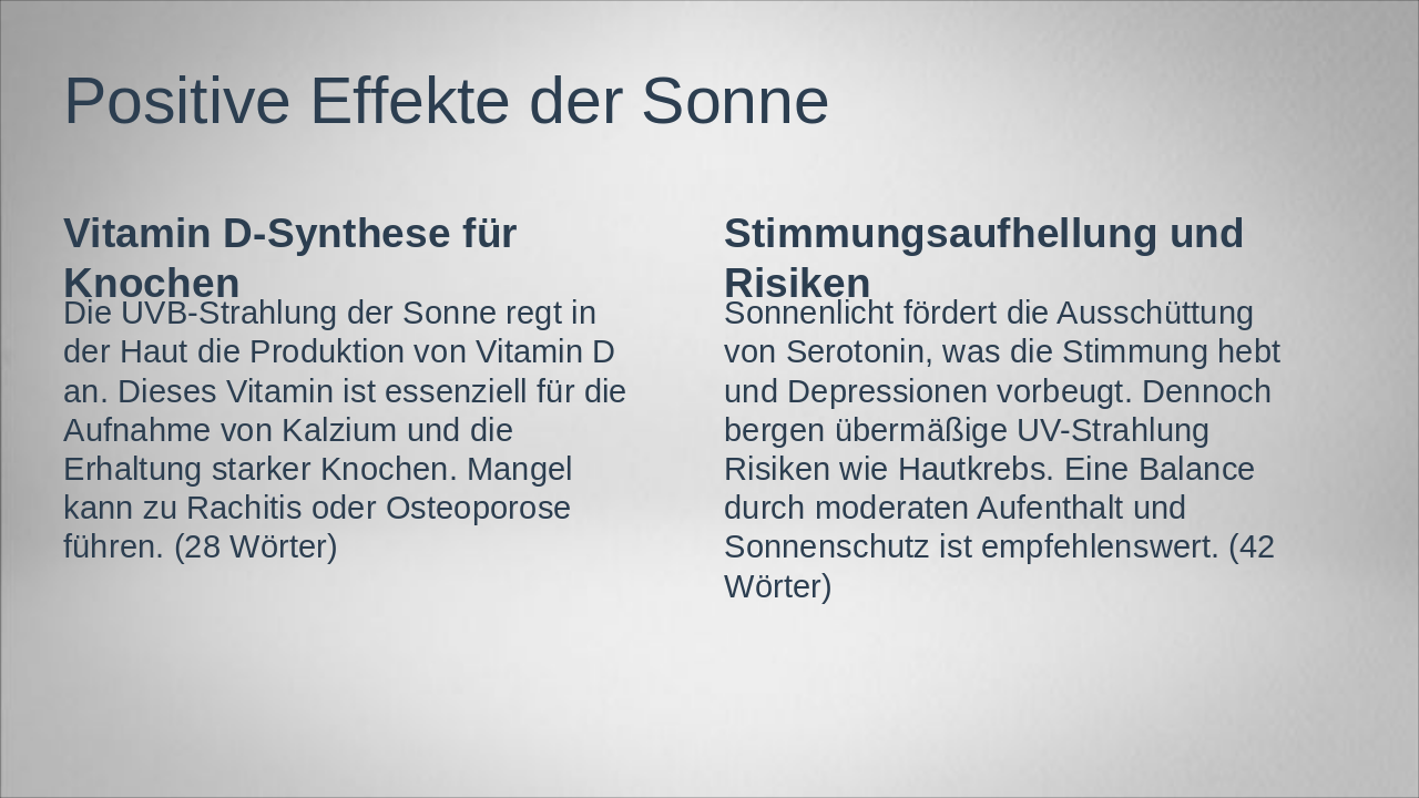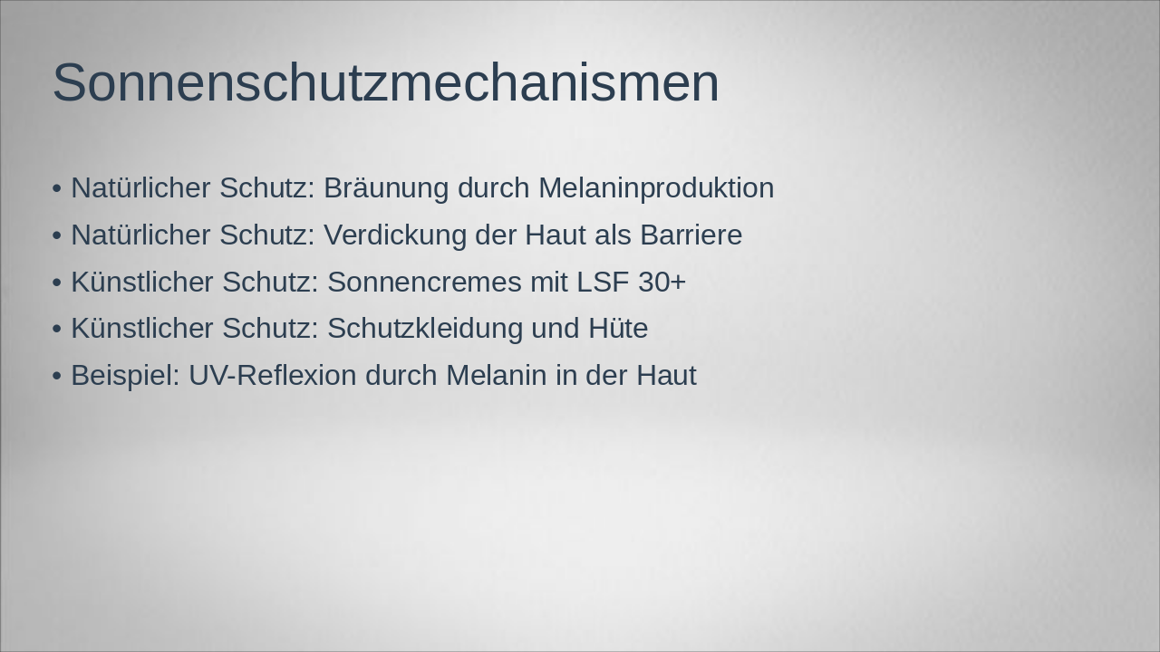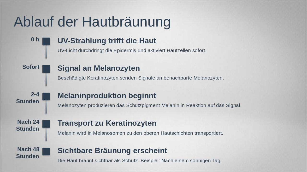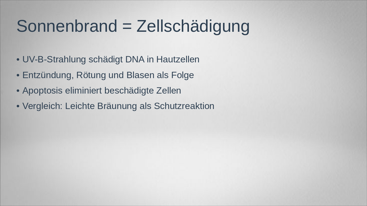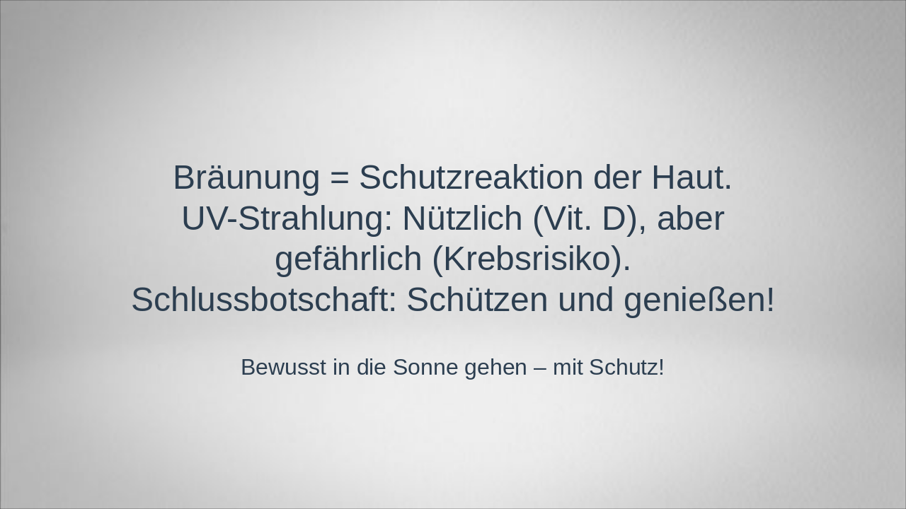 Erkläre den Mythos: Bräune signalisiert Schäden, nicht Gesundheit. Widerlege Solarien-Sicherheit und Carotin-Schutz. Ergänze mit Warnsymbolen und Beispielen für Schülervortrag.