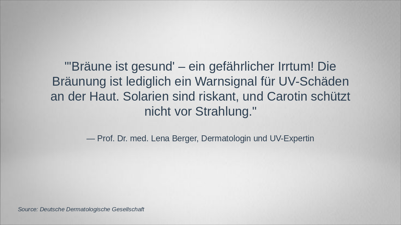 > 'Bräune ist gesund' – ein gefährlicher Irrtum! Die Bräunung ist lediglich ein Warnsignal für UV-Schäden an der Haut. Solarien sind riskant, und Carotin schützt nicht vor Strahlung.