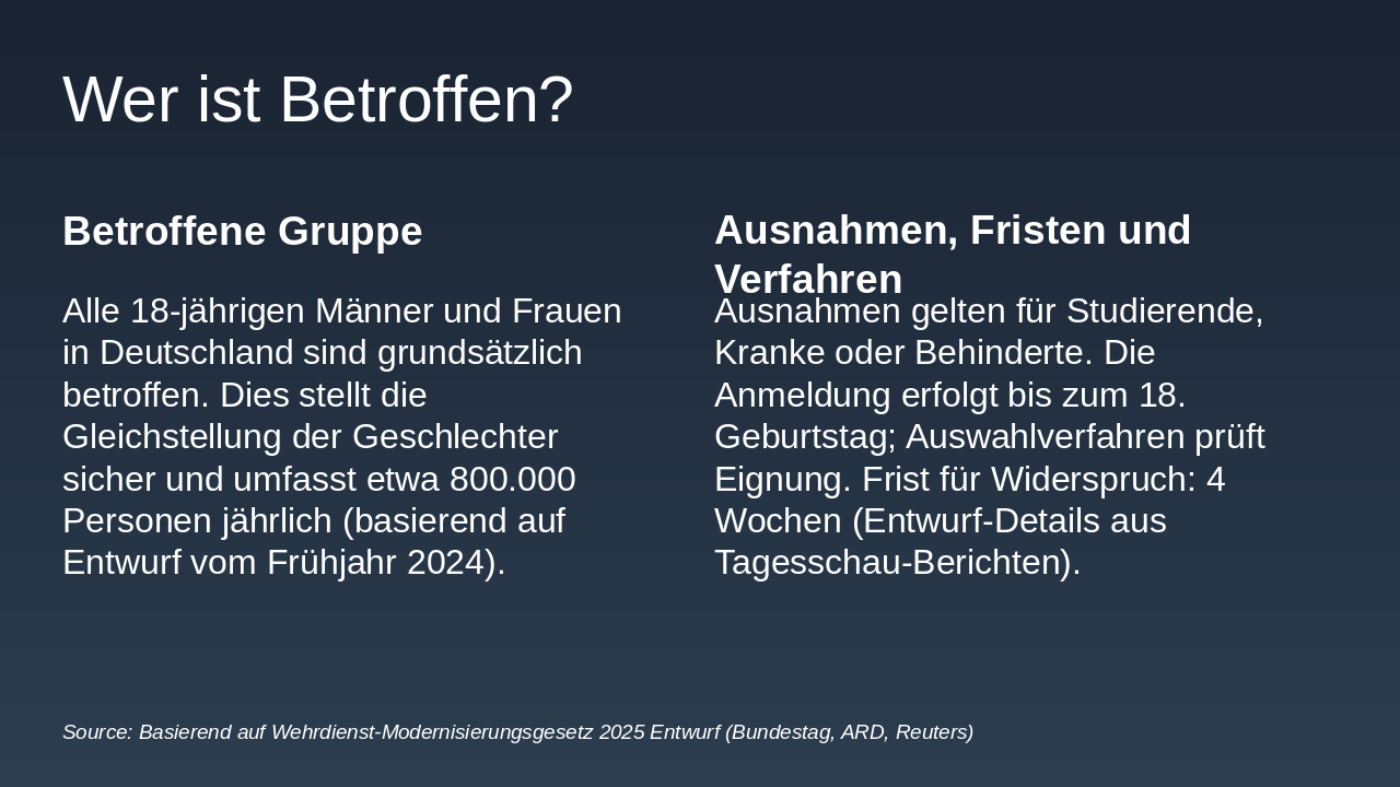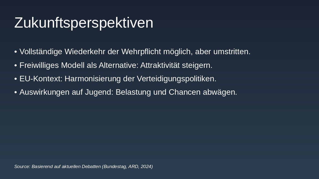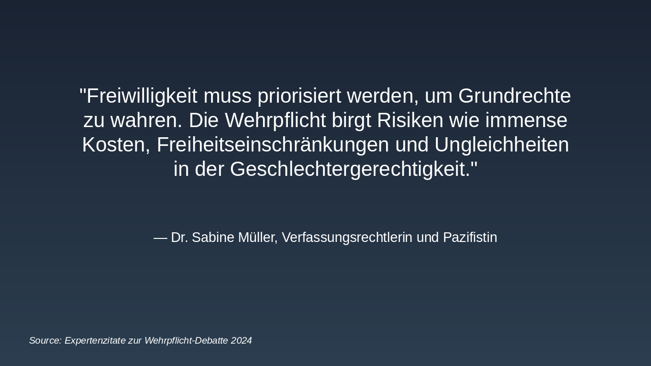 > Freiwilligkeit muss priorisiert werden, um Grundrechte zu wahren. Die Wehrpflicht birgt Risiken wie immense Kosten, Freiheitseinschränkungen und Ungleichheiten in der Geschlechtergerechtigkeit.