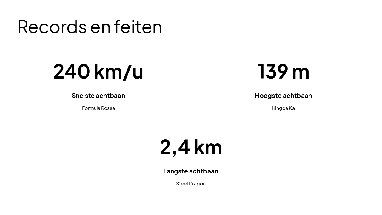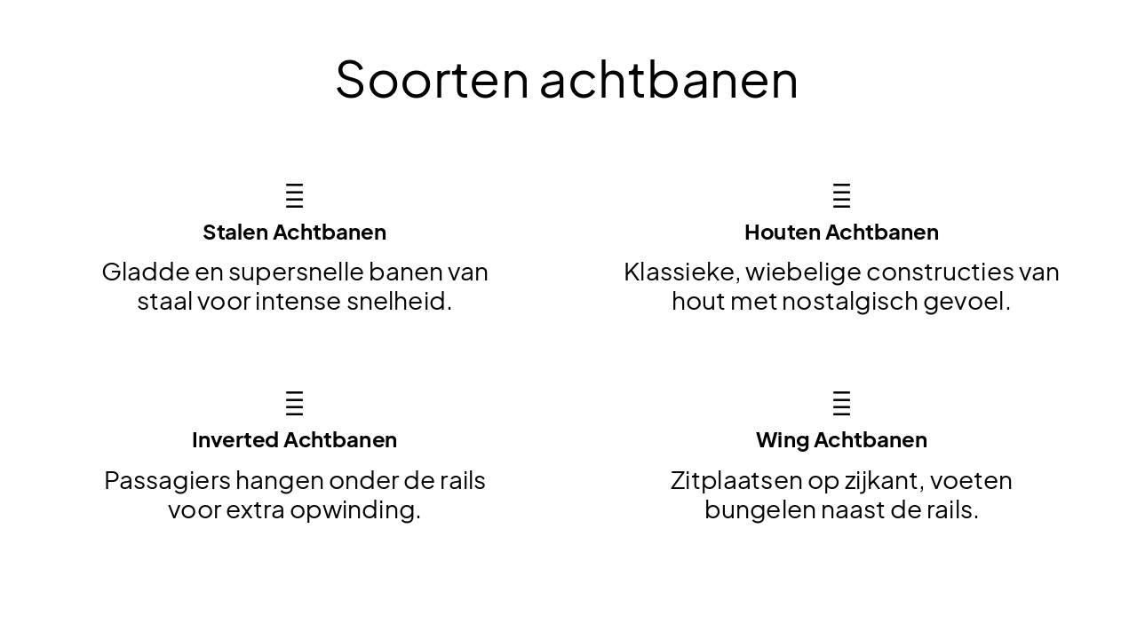 { "headers": [ "Fase", "Wat gebeurt er?", "Gevoel" ], "rows": [ [ "Lift hill", "Trein klimt omhoog met ketting.", "Spanning bouwt op!" ], [ "Eerste drop", "Steile val naar beneden!", "Maag komt omhoog ā Woehoe!" ], [ "Bochten & loops", "Scherpe bochten en koprollen.", "Kracht en snelheid!" ], [ "Remmen", "Blokken stoppen de trein veilig.", "Rustig terug naar start." ] ] }