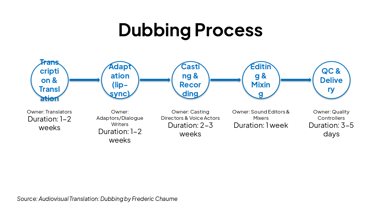 Overview of the key phases in the dubbing workflow, highlighting responsibilities and typical timelines. Emphasize synchronization and naturalness throughout.