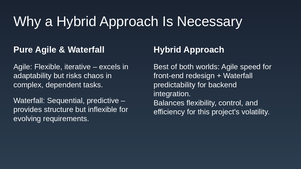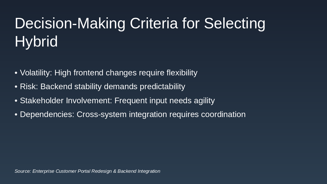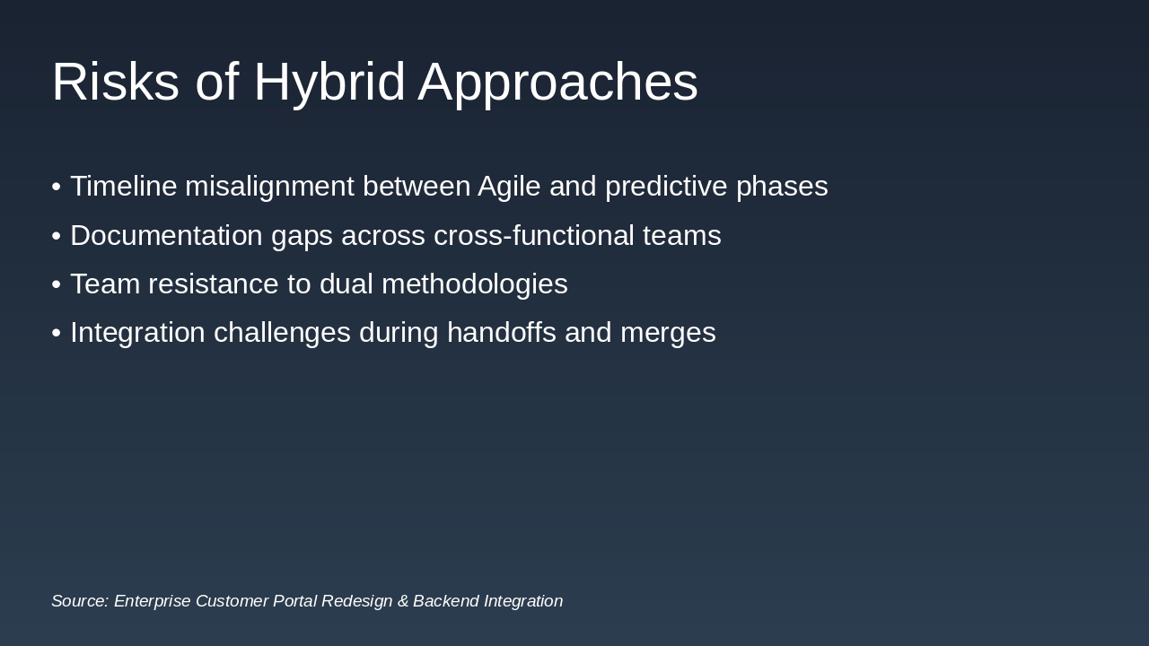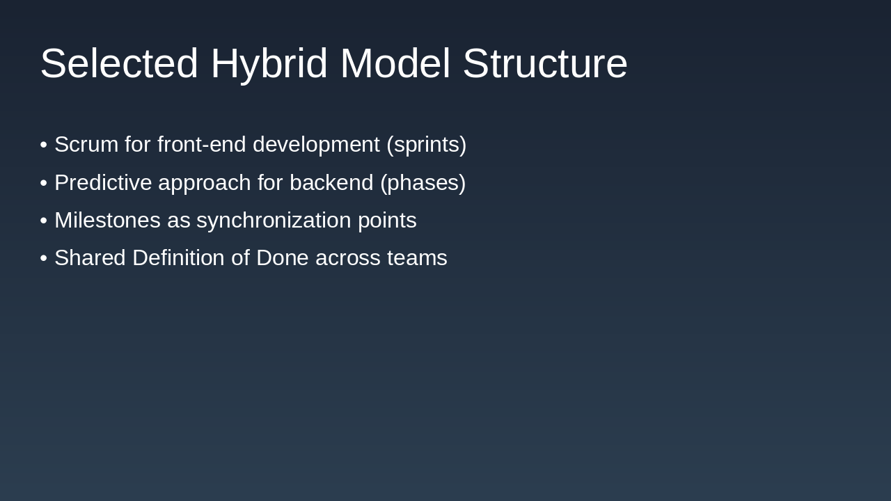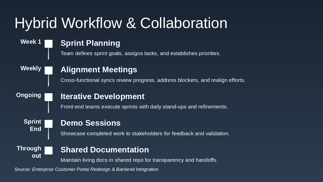 Walk through the hybrid workflow timeline: Sprint planning → Alignment meetings → Iterations → Demos → Shared docs. Emphasize how weekly syncs ensure continuous progress and alignment.