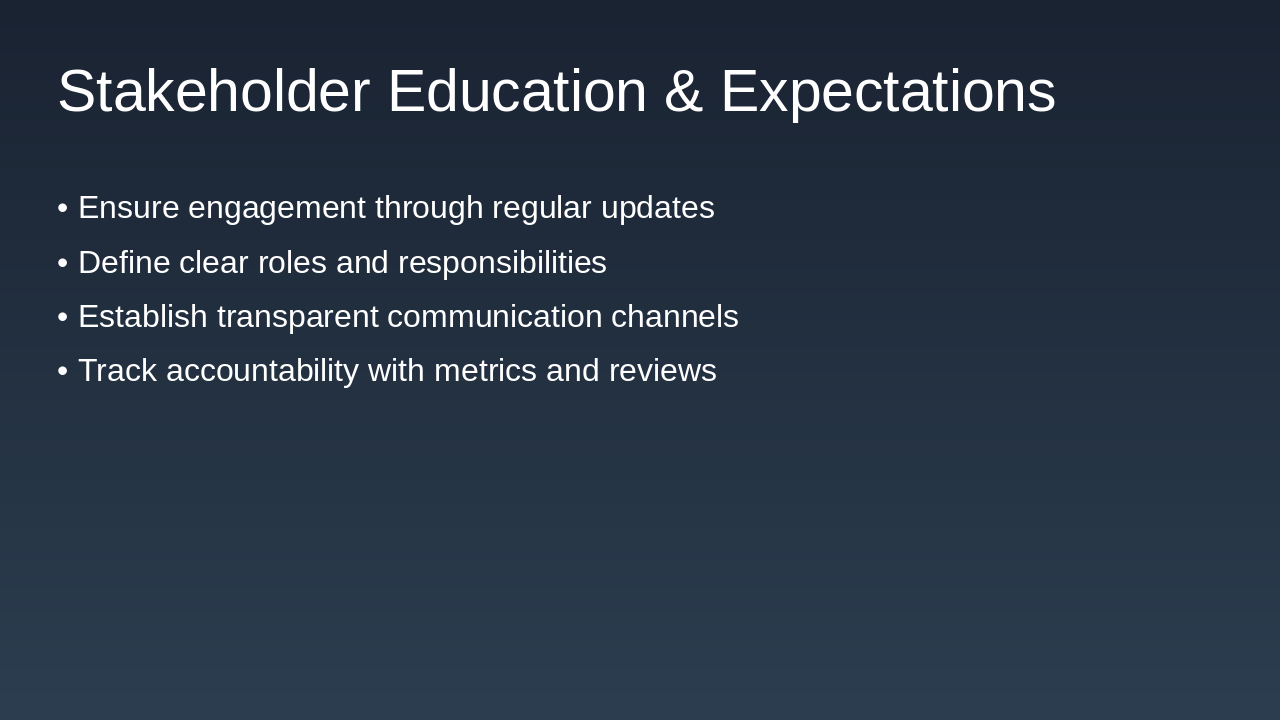 Week 1: Sprint Planning Team defines sprint goals, assigns tasks, and establishes priorities. Weekly: Alignment Meetings Cross-functional syncs review progress, address blockers, and realign efforts. Ongoing: Iterative Development Front-end teams execute sprints with daily stand-ups and refinements. Sprint End: Demo Sessions Showcase completed work to stakeholders for feedback and validation. Throughout: Shared Documentation Maintain living docs in shared repo for transparency and handoffs.