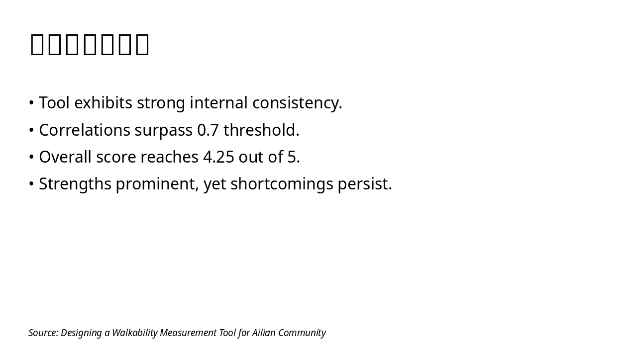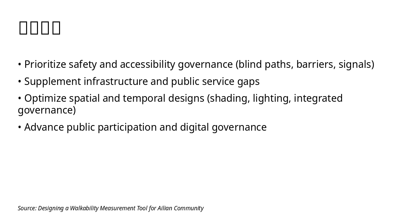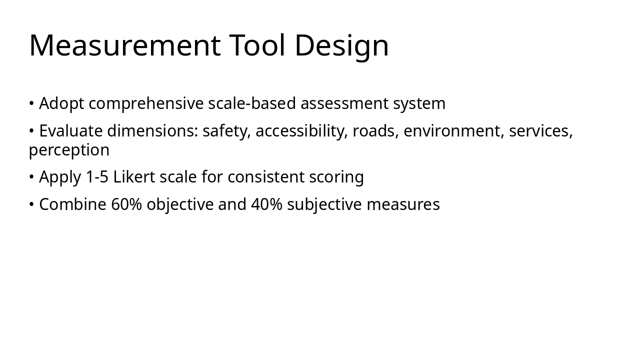 Validate tool, suggest safety enhancements, and outline path to walkable community. Source: Designing a Walkability Measurement Tool for Ailian Community