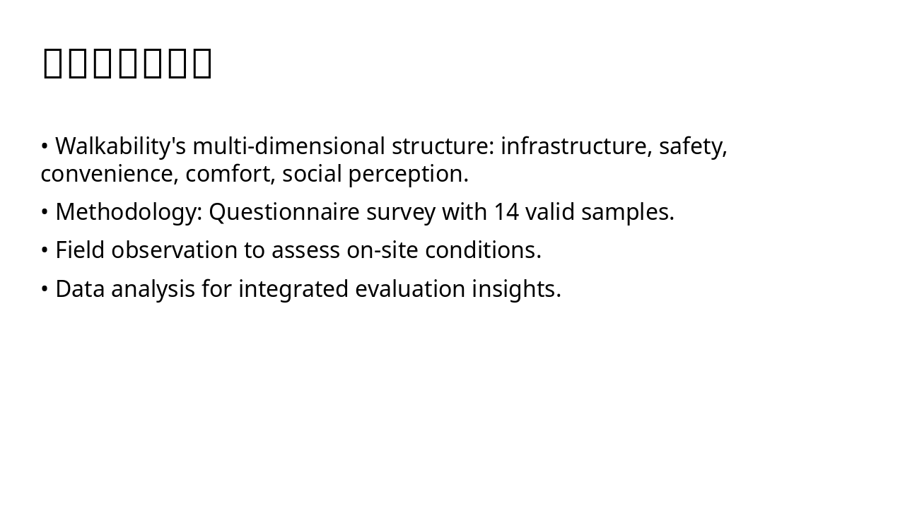Multi-dimensional walkability structure with questionnaire, observation, and scoring system.