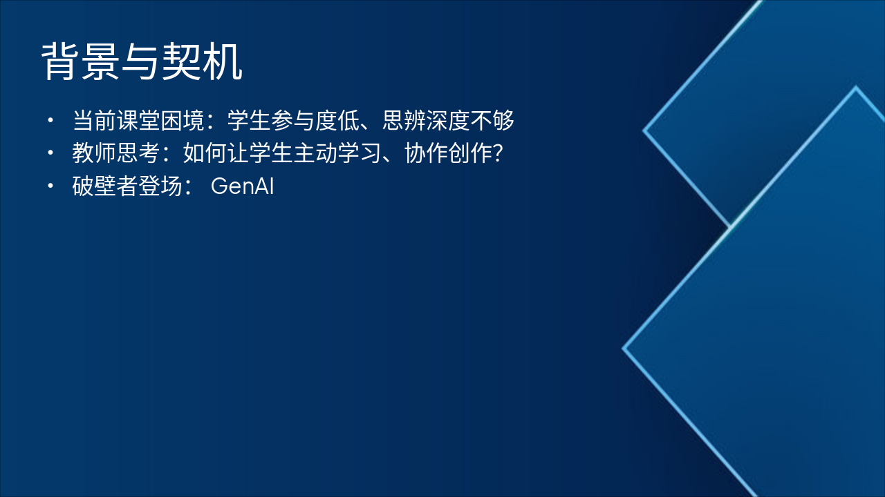 当前课堂面临学生参与度低、思辨深度不足的困境,教师思考如何激发学生主动学习与协作创作。破壁者GenAI登场,提供创新契机。