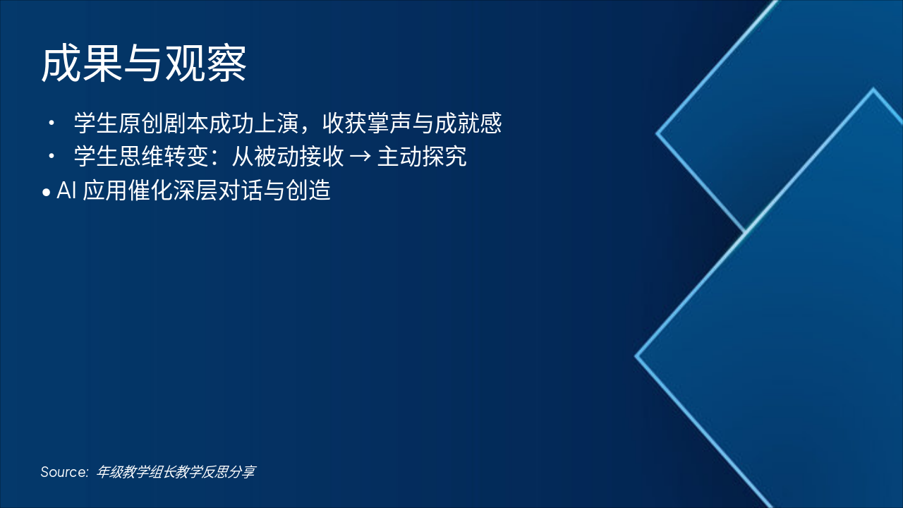 学生原创剧本成功上演,收获掌声与成就感。学生思维从被动接收转向主动探究,AI应用催化深层对话与创造。