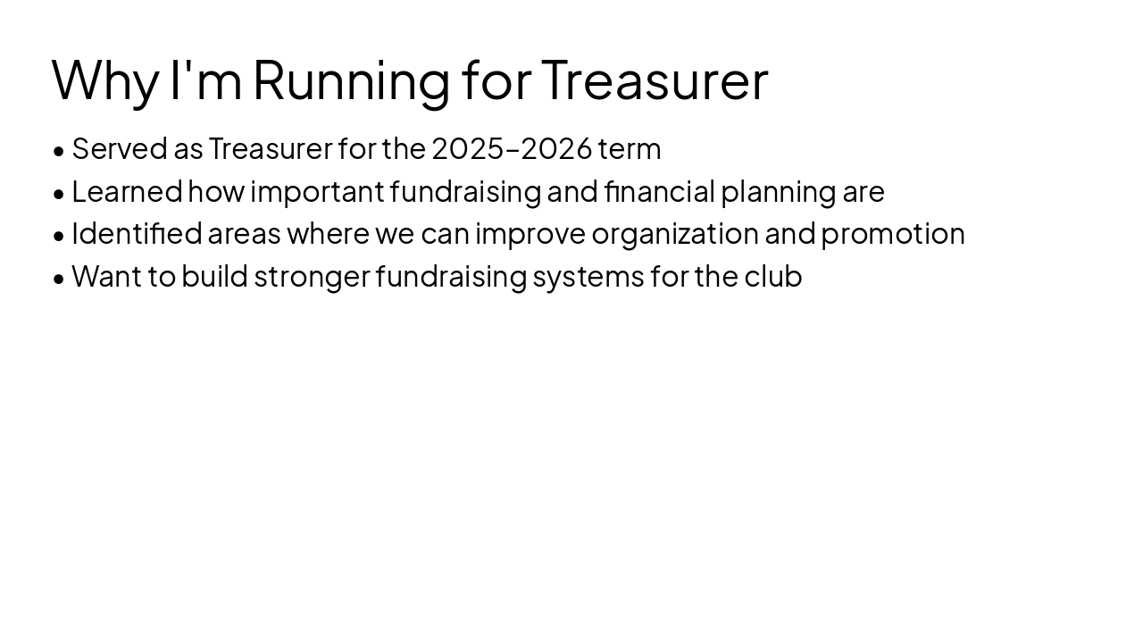 Create a clean modern Google Slides style presentation for a Key Club Treasurer election. Theme: Key Club blue (D35W style), professional, minimal text, strong visuals. Slides: 1. Title Slide Ayaan Hegde Candidate for Key Club Treasurer Arcadia Key Club 2026–2027 2. My Key Club Moment RTC freshman year listening to LTG Isabella speak Realized Key Club is more than volunteering – it's a community That moment made me excited to be involved in service 3. Why I'm Running for Treasurer Served as Treasurer for the 2025–2026 term Learned how important fundraising and financial planning are Identified areas where we can improve organization and promotion Want to build stronger fundraising systems for the club 4. Experience as Treasurer Managed club fundraiser funds Tracked donations and balances Created organized spreadsheets to track finances Focused on transparency and efficiency 5. Organized Financial Tracking Created dynamic spreadsheets to track Fundraiser revenue Payment methods Club balance Automatic totals and color coding 6. Fundraising Vision Introduce member‑driven fundraisers Create clear goals and incentives Increase member involvement Raise more funds for PTP and Arcadia Key Club 7. Featured Fundraiser: Lychee Jelly Sales Each member sells one jar 40 jellies per jar $0.50 per jelly Up to $20 per jar Prizes or service hours for top sellers 8. Additional Fundraisers BJ's Restaurant fundraiser Holiday Social food/item sales First Avenue Night Market booth 9. Fundraising Goals 2026–2027 Total Goal: $800 $650 for Pediatric Trauma Program (PTP) $150 for Arcadia Key Club Achievable with strong participation 10. Supporting Club Growth Work closely with PR and board members Create clear promotion timelines Encourage participation from all members Make fundraisers fun and engaging 11. Closing Experience Organization Clear fundraising strategy Excited to help Key Club grow