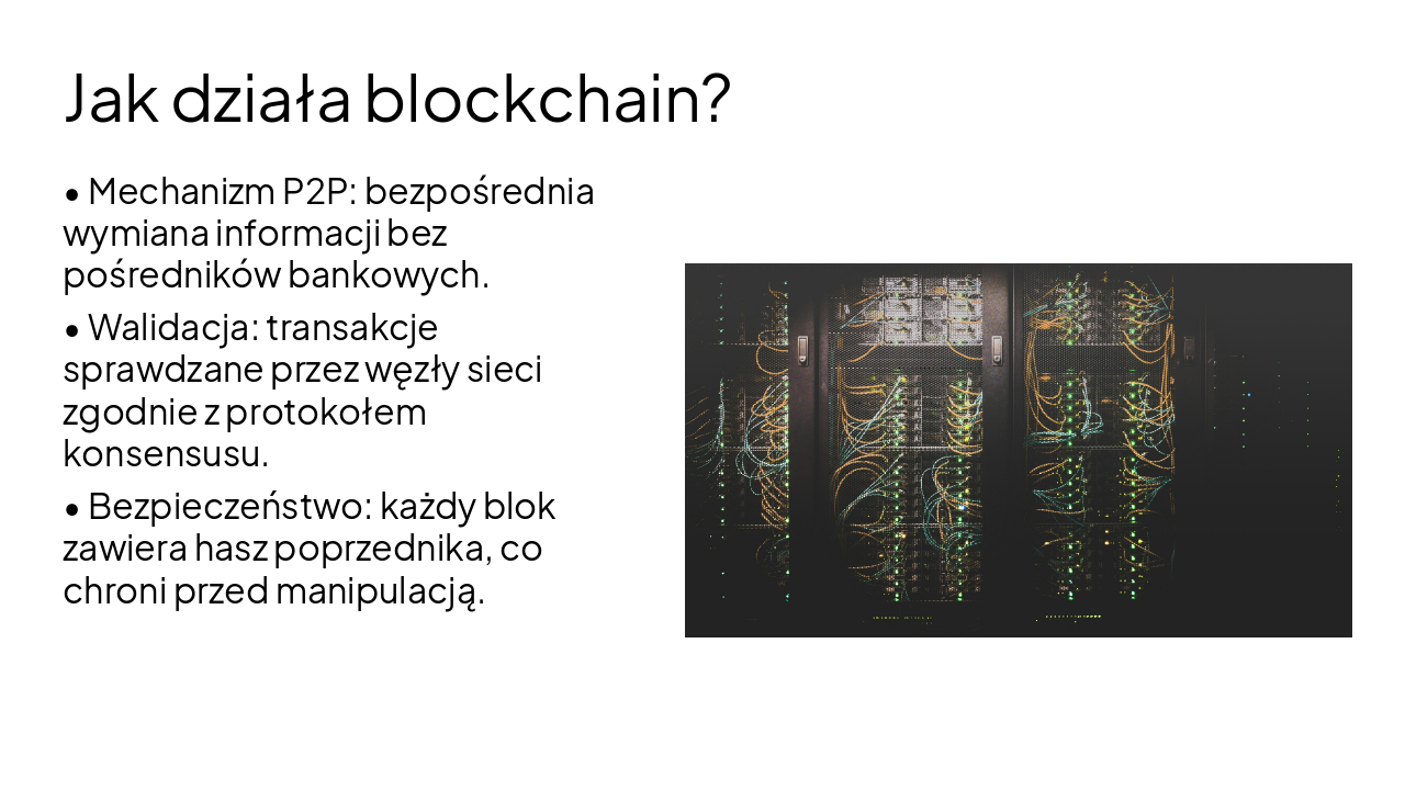 Stwórz profesjonalną prezentację (ok. 10–15 slajdów) na temat: Blockchain w finansach. Prezentacja ma być przejrzysta, logicznie uporządkowana i odpowiednia na poziom studiów. Uwzględnij następującą strukturę: Slajd tytułowy – temat, autorzy (2 osoby), data Wprowadzenie do blockchaina czym jest blockchain podstawowe pojęcia (blok, łańcuch bloków, decentralizacja) Jak działa blockchain mechanizm działania walidacja transakcji rola sieci peer-to-peer Zastosowania w sektorze finansowym kryptowaluty płatności międzynarodowe smart kontrakty bankowość Zalety blockchaina bezpieczeństwo przejrzystość decentralizacja brak pośredników Wady i wyzwania skalowalność zużycie energii regulacje prawne adopcja technologii Przykłady firm i projektów Bitcoin Ethereum Ripple inne znane firmy wykorzystujące blockchain Aktualne trendy DeFi NFT rozwój CBDC (cyfrowe waluty banków centralnych) Przewidywania na przyszłość rozwój technologii wpływ na sektor finansowy Podsumowanie najważniejsze wnioski Slajd końcowy pytania / dyskusja Dodatkowe wymagania: krótki tekst na slajdach (punkty, nie długie akapity) nowoczesny design użyj przykładów z życia język: polski
