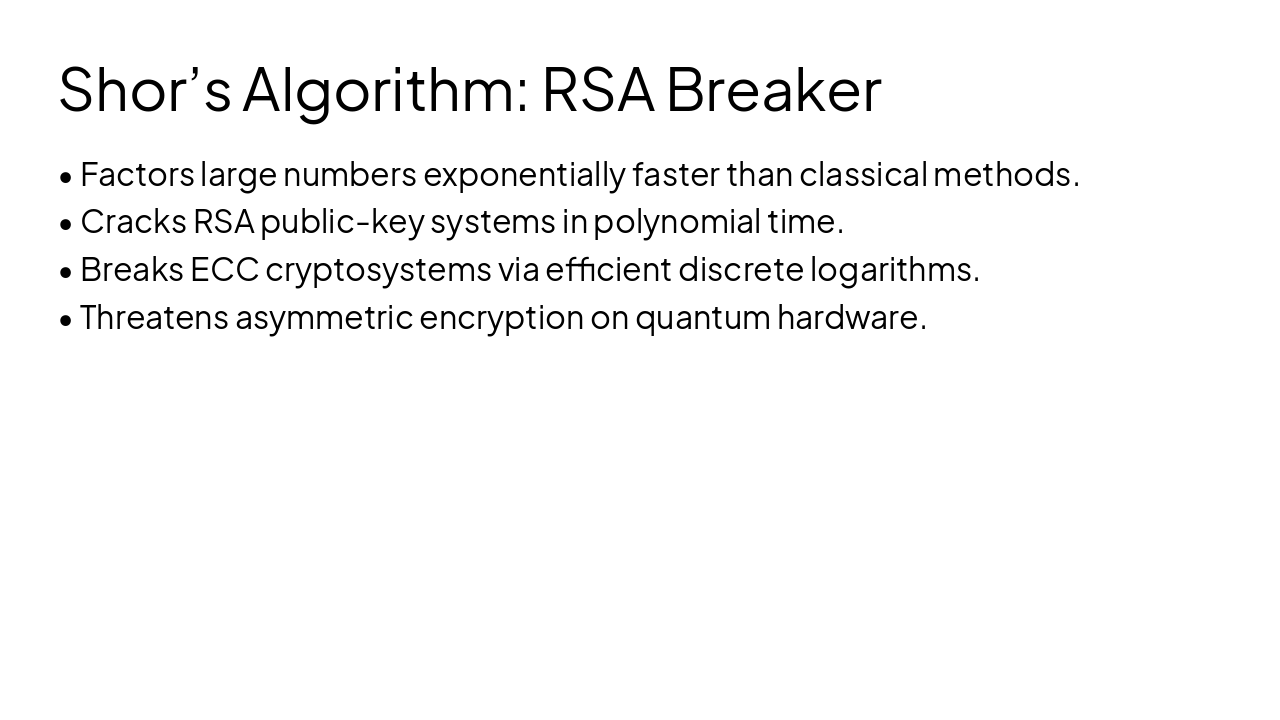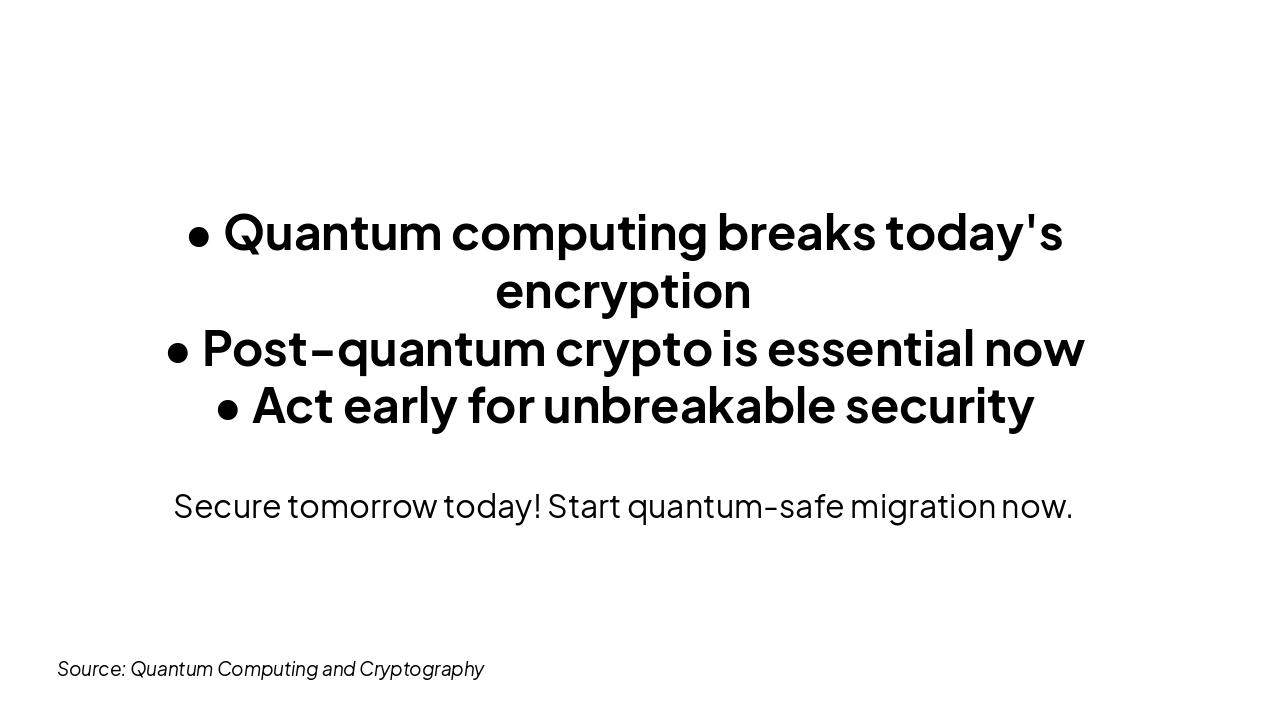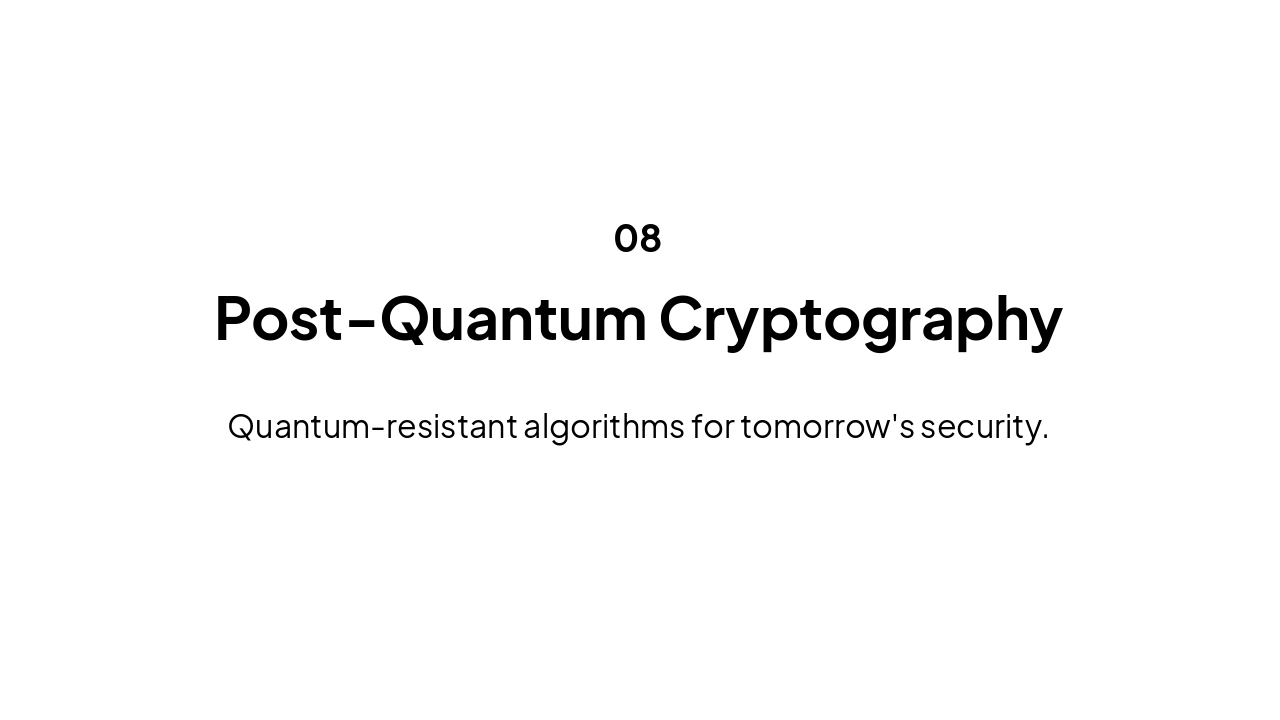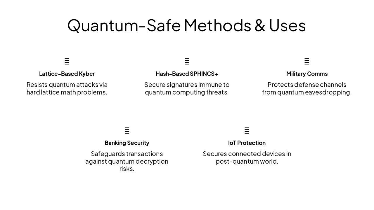 { "features": [ { "icon": "🧱", "heading": "Lattice-Based Kyber", "description": "Resists quantum attacks via hard lattice math problems." }, { "icon": "🔐", "heading": "Hash-Based SPHINCS+", "description": "Secure signatures immune to quantum computing threats." }, { "icon": "📡", "heading": "Military Comms", "description": "Protects defense channels from quantum eavesdropping." }, { "icon": "🏦", "heading": "Banking Security", "description": "Safeguards transactions against quantum decryption risks." }, { "icon": "🔌", "heading": "IoT Protection", "description": "Secures connected devices in post-quantum world." } ] }