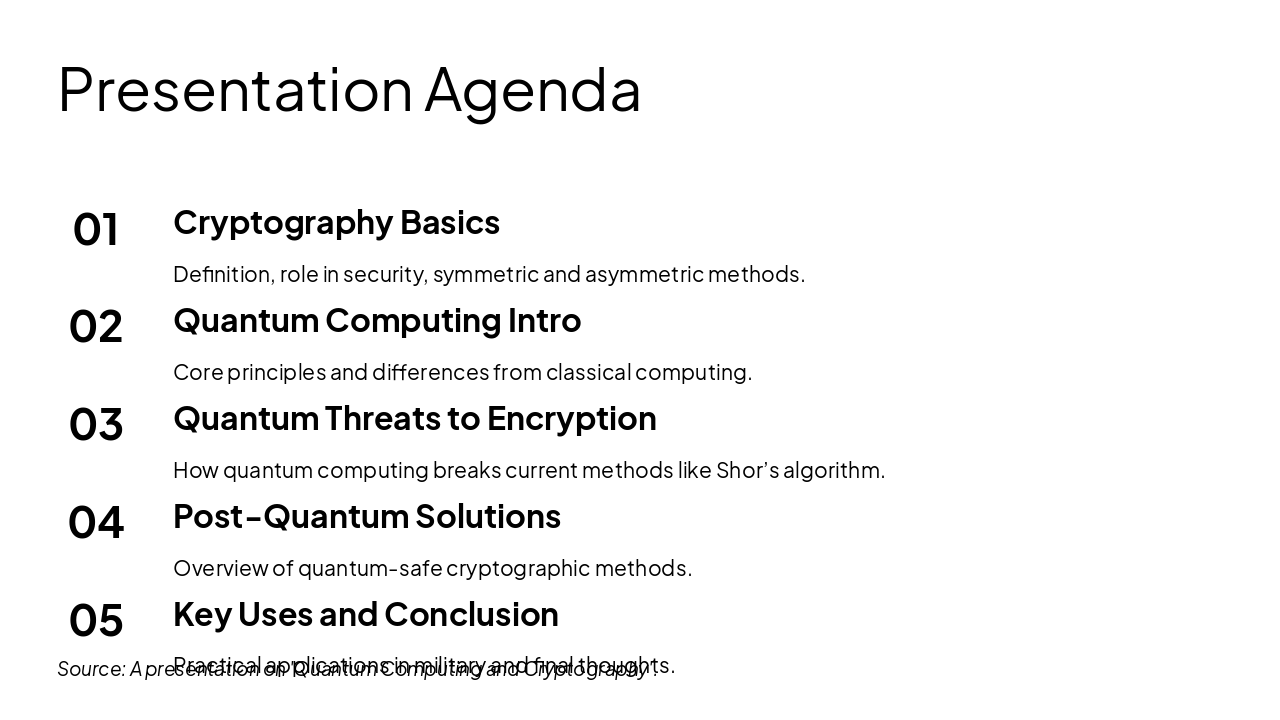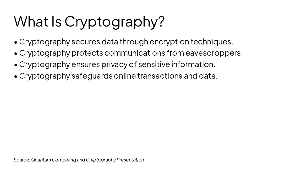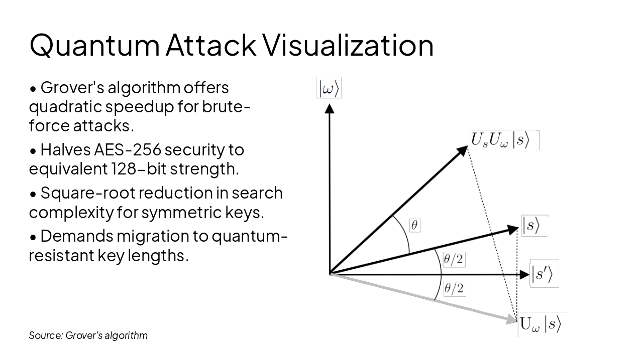 The slide introduces quantum-safe cryptographic methods like Lattice-Based Kyber and Hash-Based SPHINCS+, which resist quantum attacks via lattice math and secure hash signatures. It also highlights uses in military comms, banking security, and IoT protection to counter quantum eavesdropping and decryption risks.