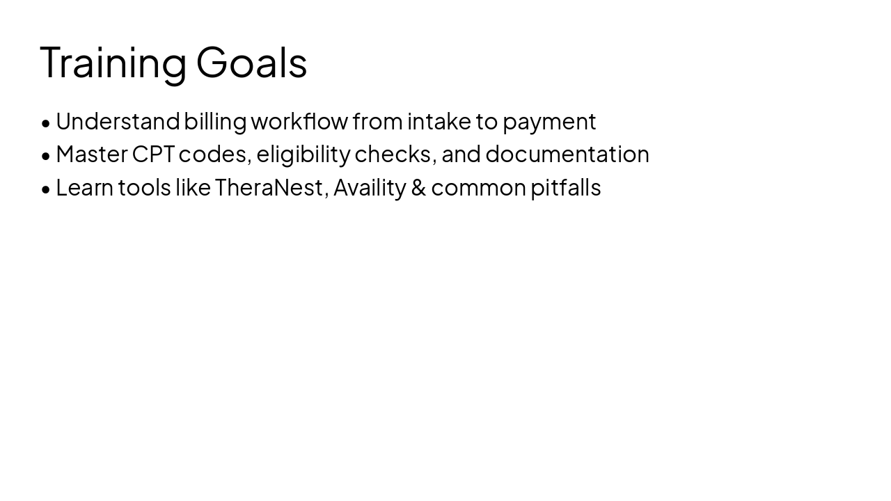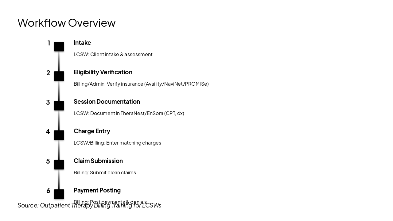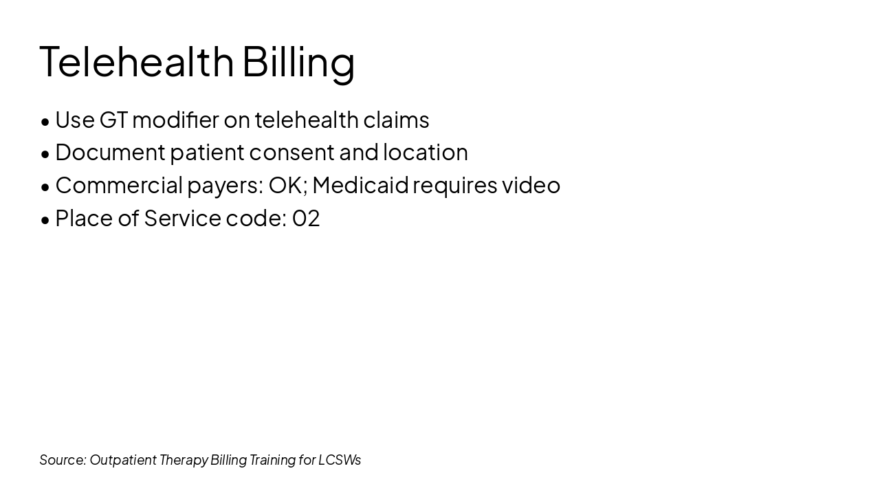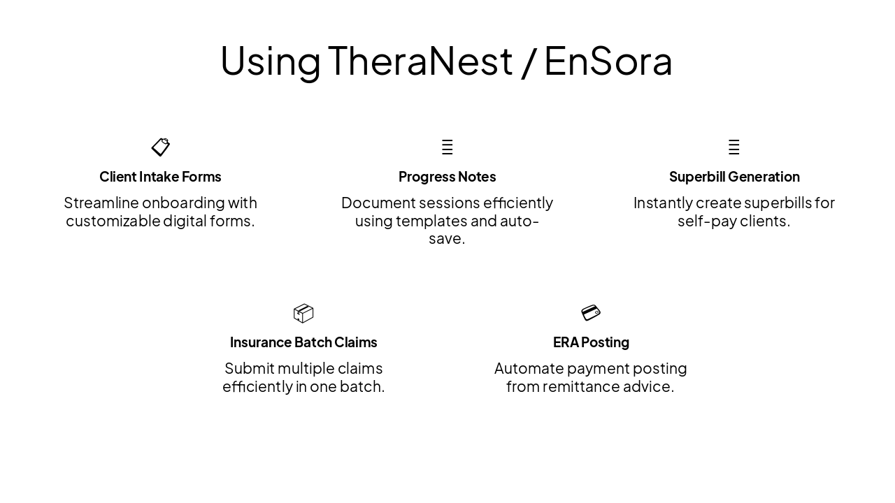 { "features": [ { "icon": "📋", "heading": "Client Intake Forms", "description": "Streamline onboarding with customizable digital forms." }, { "icon": "📝", "heading": "Progress Notes", "description": "Document sessions efficiently using templates and auto-save." }, { "icon": "🧾", "heading": "Superbill Generation", "description": "Instantly create superbills for self-pay clients." }, { "icon": "📦", "heading": "Insurance Batch Claims", "description": "Submit multiple claims efficiently in one batch." }, { "icon": "💳", "heading": "ERA Posting", "description": "Automate payment posting from remittance advice." } ] }