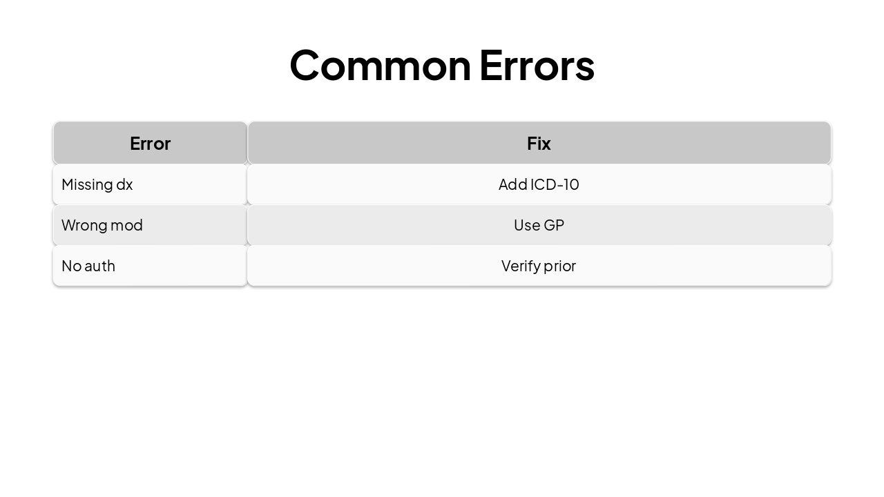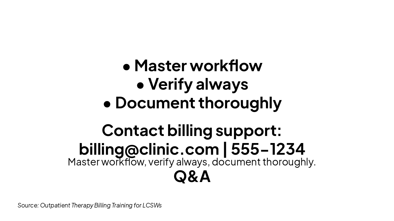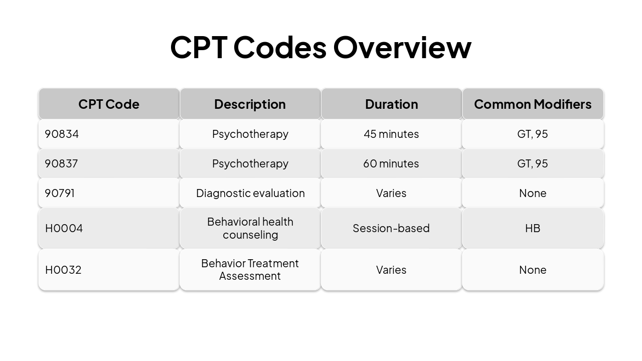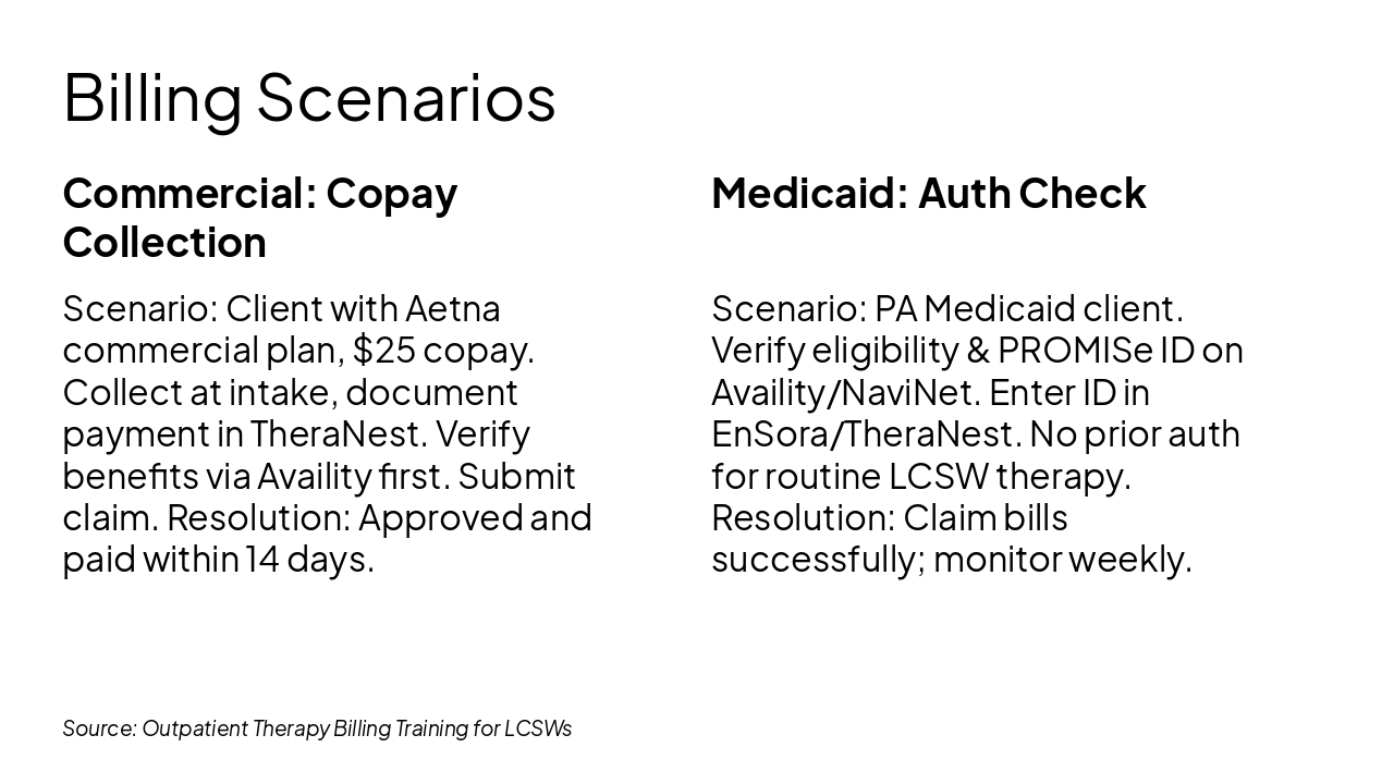 { "features": [ { "icon": "📋", "heading": "Client Intake Forms", "description": "Streamline onboarding with customizable digital forms." }, { "icon": "📝", "heading": "Progress Notes", "description": "Document sessions efficiently using templates and auto-save." }, { "icon": "🧾", "heading": "Superbill Generation", "description": "Instantly create superbills for self-pay clients." }, { "icon": "📦", "heading": "Insurance Batch Claims", "description": "Submit multiple claims efficiently in one batch." }, { "icon": "💳", "heading": "ERA Posting", "description": "Automate payment posting from remittance advice." } ] }