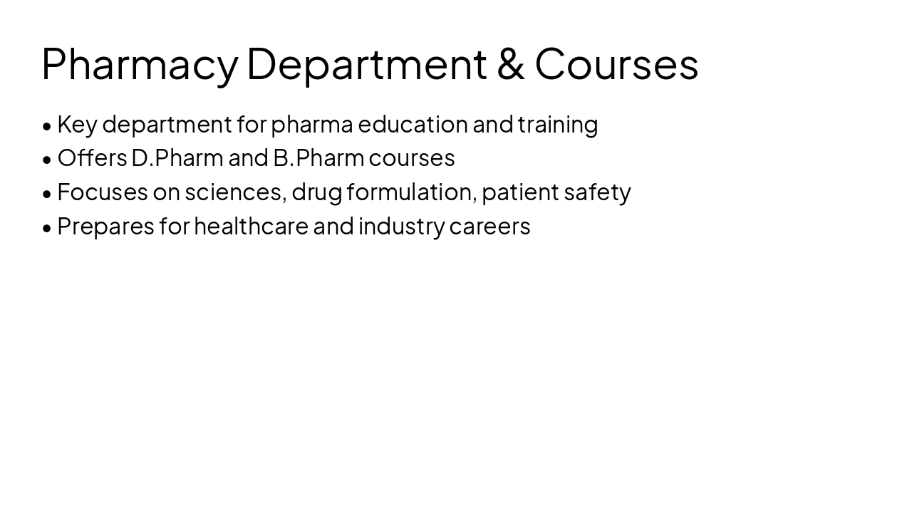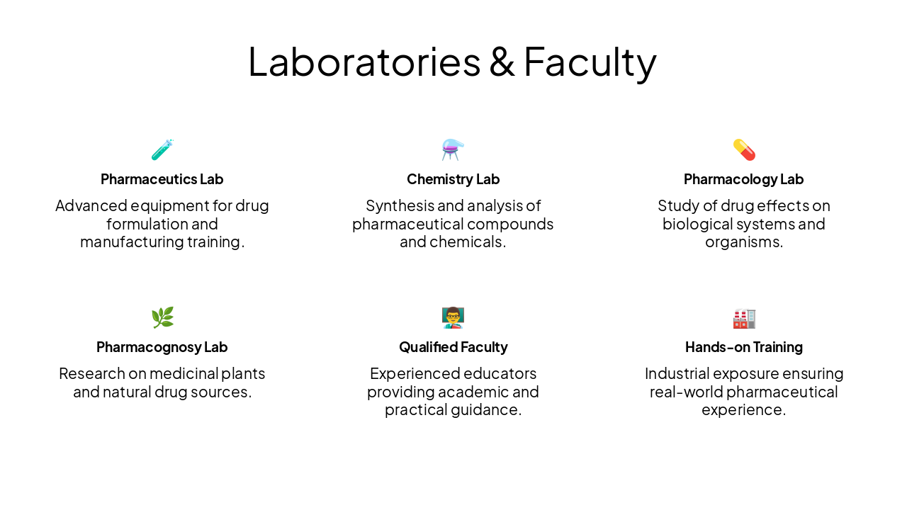 { "features": [ { "icon": "🧪", "heading": "Pharmaceutics Lab", "description": "Advanced equipment for drug formulation and manufacturing training." }, { "icon": "⚗️", "heading": "Chemistry Lab", "description": "Synthesis and analysis of pharmaceutical compounds and chemicals." }, { "icon": "💊", "heading": "Pharmacology Lab", "description": "Study of drug effects on biological systems and organisms." }, { "icon": "🌿", "heading": "Pharmacognosy Lab", "description": "Research on medicinal plants and natural drug sources." }, { "icon": "👨🏫", "heading": "Qualified Faculty", "description": "Experienced educators providing academic and practical guidance." }, { "icon": "🏭", "heading": "Hands-on Training", "description": "Industrial exposure ensuring real-world pharmaceutical experience." } ] }