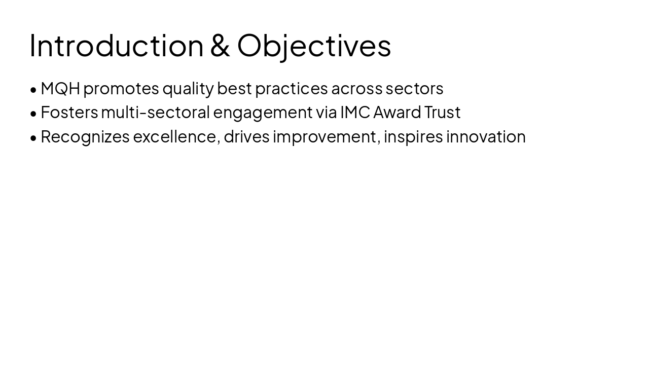 This is a title slide titled "MQH Best Practices 2025." The subtitle describes it as a thesis presentation on the IMC Ramkrishna Bajaj National Quality Award Trust Initiative.