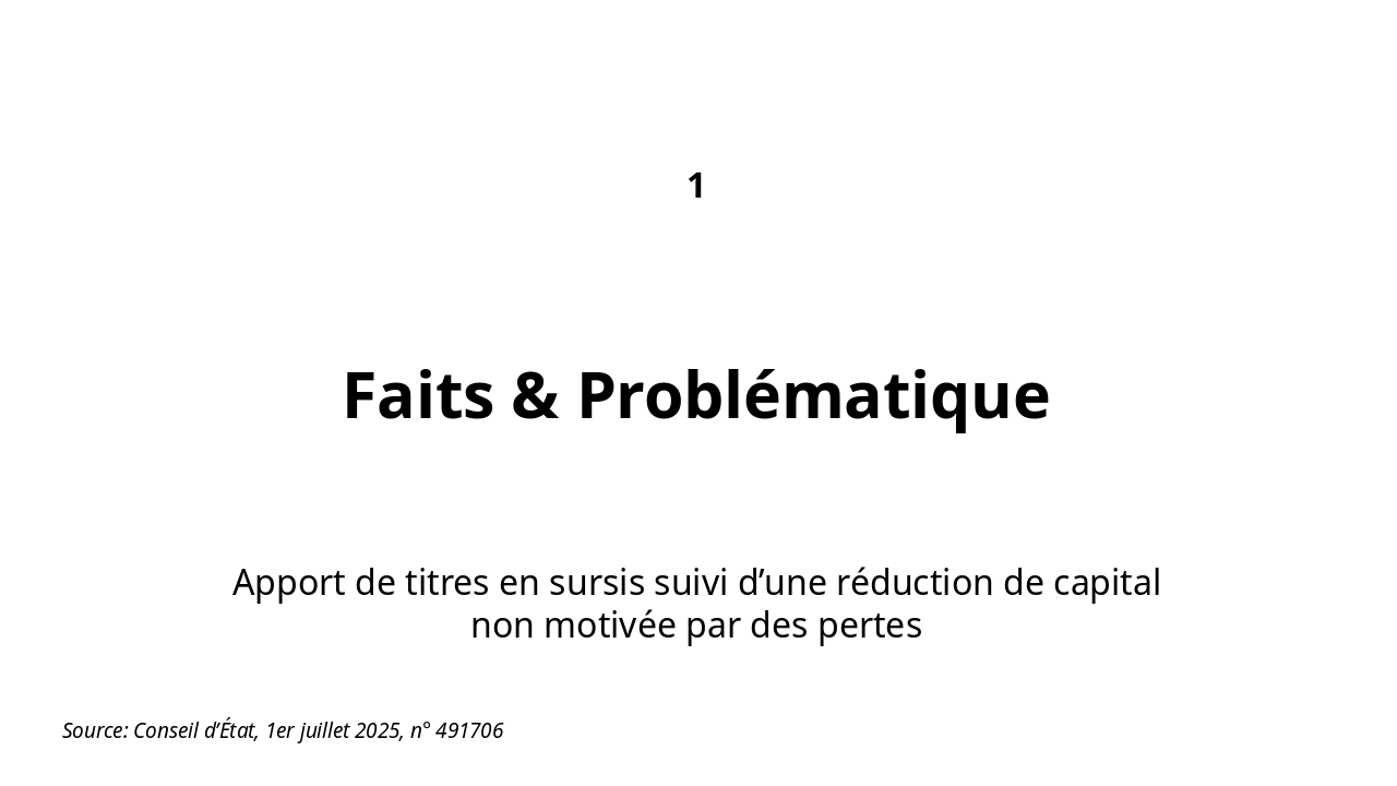 2020: Acquisition des titres L'associé acquiert des titres à un prix déterminé, base pour le régime fiscal ultérieur. 2021: Apport à la société Apport des titres avec sursis d’imposition selon l’article 150-0 B du CGI. 2022: Réduction de capital Réduction de capital non motivée par des pertes, générant une somme à distribuer. 2023: Versement à l’associé La somme issue de la réduction est versée à l’associé comme remboursement d’apport. 2024: Requalification par administration L’administration requalifie les sommes en revenus distribués imposables selon articles 112 et 120 CGI.