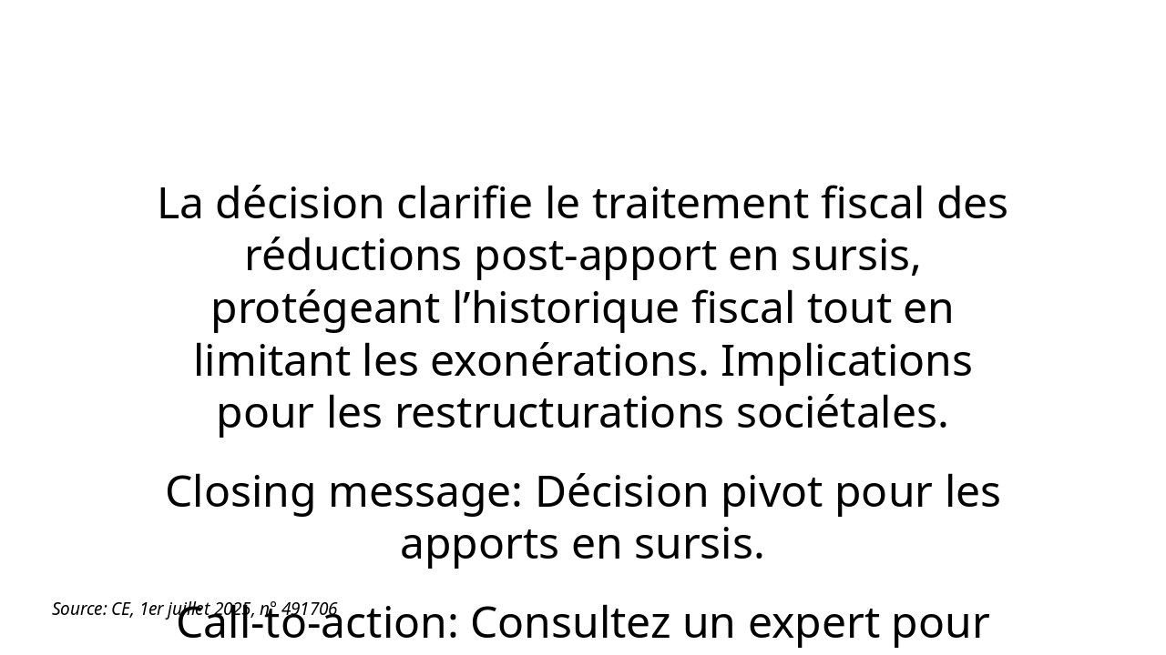 Infographie chronologique illustrant la séquence des opérations fiscales et la requalification par l’administration. Problématique : articulation du sursis d’imposition et traitement des réductions de capital.
