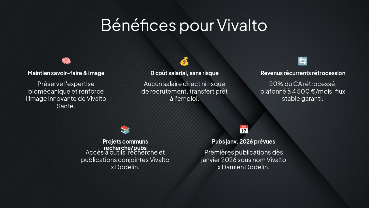 Cette diapositive de titre présente une proposition de cession d’actifs et de continuité biomécanique entre Biomeca Institut et Vivalto Santé. Le sous-titre met en avant un pôle biomécanique différenciant pour la Clinique du Sport.