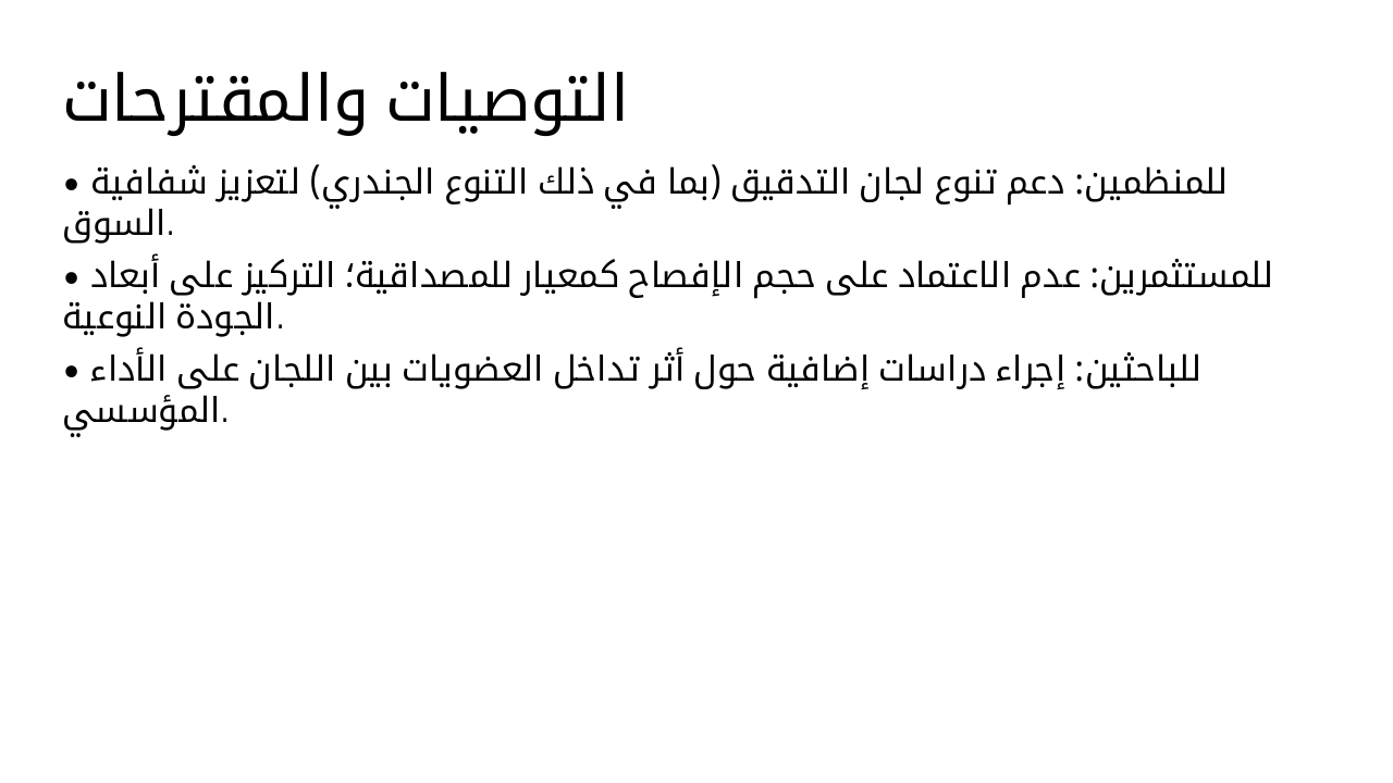 الشريحة الأولى: عنوان العرض * العنوان: جودة الإفصاح مقابل كميته: دور لجنة التدقيق في المؤسسات المالية العمانية. * إعداد الباحثين: هداية اللواتي، خالد حسيني، ورزا ساجيتوفا. * تاريخ النشر: يناير 2021. الشريحة الثانية: مقدمة وسياق الدراسة * تعتبر لجنة التدقيق (AC) آلية محورية في حوكمة الشركات لمراقبة سلوك المديرين وحماية مصالح المساهمين. * تركز الدراسة على سلطنة عمان كونها أول دولة في الشرق الأوسط تصدر ميثاق حوكمة الشركات (عام 2002)، والذي تم تحديثه في 2016. * الهدف: فحص تأثير خصائص لجنة التدقيق على جودة وكمية "الإفصاح الاستشرافي" (Forward-Looking Disclosure) في التقارير السنوية. الشريحة الثالثة: مشكلة الدراسة وأهميتها * الفجوة البحثية: معظم الدراسات السابقة استخدمت "كمية" الإفصاح كمقياس لـ "جودته"، وتختبر هذه الدراسة ما إذا كان هذا الافتراض صحيحاً. * الأهمية: أول دراسة في عمان والمنطقة تبحث في مجموعة شاملة من خصائص لجنة التدقيق وعلاقتها بجودة الإفصاح. * القطاع: التركيز على القطاع المالي العماني (2014-2018) لكونه ركيزة أساسية لرؤية عمان 2040. الشريحة الرابعة: النظريات المستخدمة تعتمد الدراسة على تكامل ثلاث نظريات لتفسير النتائج: 1. نظرية الوكالة: دور اللجنة في تقليل فجوة المعلومات بين الإدارة والمساهمين. 2. نظرية الاعتماد على الموارد: كيف تجلب خصائص الأعضاء (خبرة، علاقات) موارد قيمة للشركة. 3. نظرية رأس المال الاجتماعي: أثر الشبكات الاجتماعية والعلاقات المهنية للأعضاء في تحسين جودة التقارير. الشريحة الخامسة: منهجية البحث * العينة: شركات مالية عمانية مدرجة في سوق مسقط للأوراق المالية (180 مشاهدة). * البيانات: جُمعت يدوياً من التقارير السنوية وبيانات بلومبرج. * قياس الجودة: تم قياس جودة الإفصاح بناءً على أربعة أبعاد: (المالي، الكمي، نبرة الإفصاح، والتوجه الزمني). الشريحة السادسة: النتائج الرئيسية (1) * الخصائص المعززة للجودة: وجد البحث أن (حجم لجنة التدقيق، وجود عضوات نساء، والأعضاء ذوي العضويات المتعددة "المتشابكة") يحسن بشكل كبير من جودة الإفصاح الاستشرافي. * كمية مقابل جودة: أثبتت النتائج عدم وجود علاقة بين كمية الإفصاح وجودته، مما يعني أن الإفصاح الكثير لا يعني بالضرورة إفصاحاً جيداً. الشريحة السابعة: النتائج الرئيسية (2) * النتائج العكسية: بشكل مفاجئ، وجد أن (استقلالية اللجنة، تكرار الاجتماعات، والخبرة المالية) ارتبطت سلبياً بجودة الإفصاح في السياق العماني. * التفسير المقترح: قد يركز الأعضاء المستقلون أو الخبراء على تقليل الإفصاح الاستشرافي لتجنب التكاليف القانونية أو الضغوط العامة إذا لم تتحقق التوقعات المستقبيلة. الشريحة الثامنة: التوصيات والمقترحات * للمنظمين: تشجيع الشركات على تعيين لجان تدقيق بخصائص متنوعة (مثل التنوع الجندري) لتعزيز شفافية السوق. * للمستثمرين: عدم الاعتماد على حجم الإفصاح (عدد الكلمات) كمقياس للمصداقية، بل التركيز على أبعاد الجودة. * للباحثين: دراسة أثر تداخل العضويات بين لجان التدقيق واللجان الأخرى على أداء الشركة. الشريحة التاسعة: الخاتمة * تؤكد الدراسة أن فعالية لجنة التدقيق في عمان تتجاوز مجرد مراقبة الأرقام المالية لتشمل تحسين جودة المعلومات السردية والمستقبلية المقدمة للسوق.