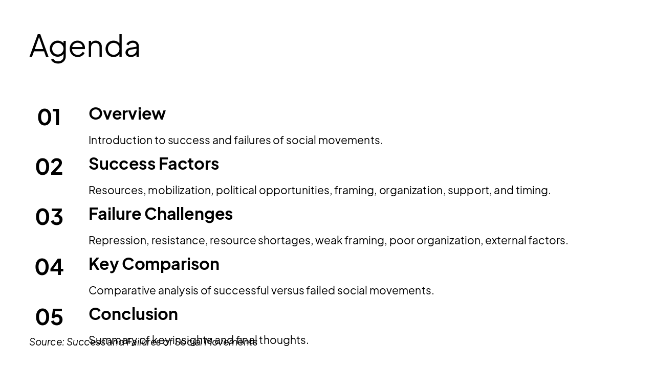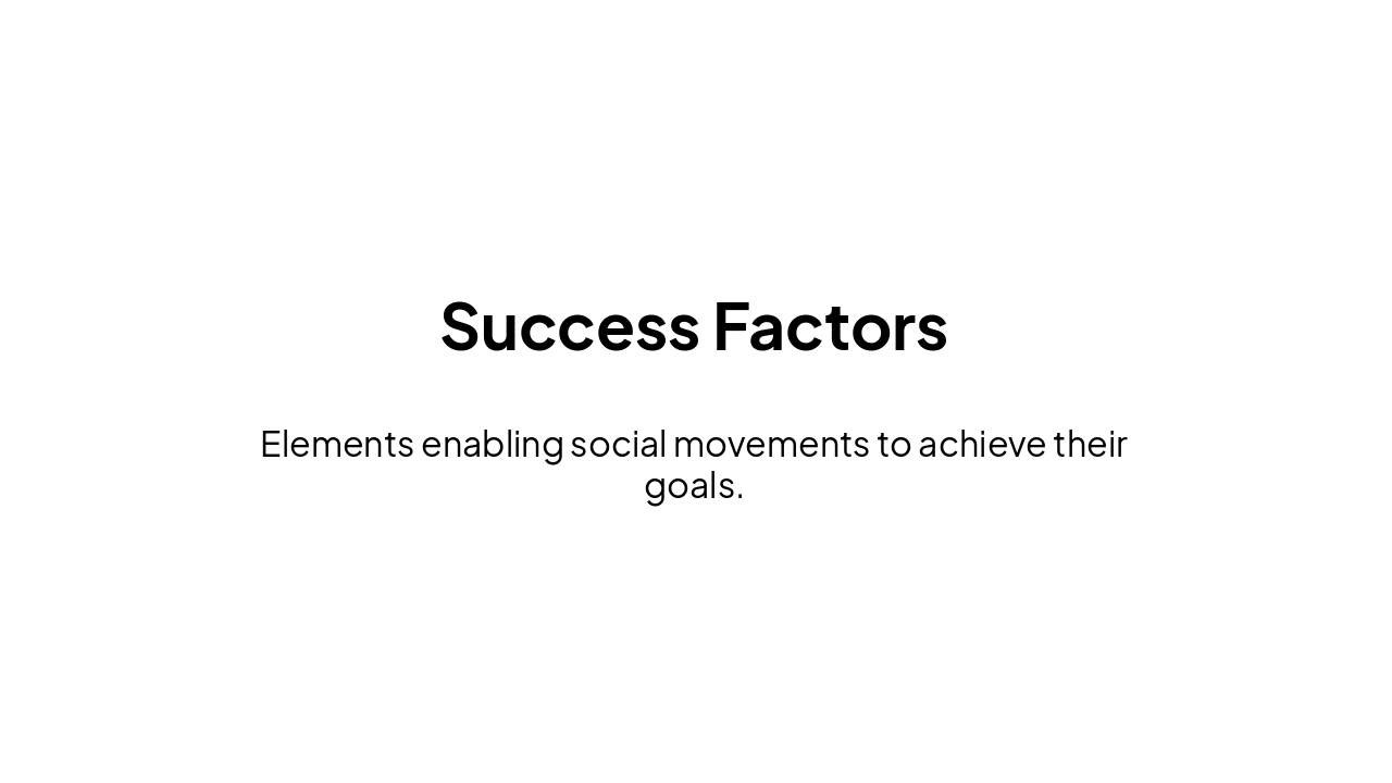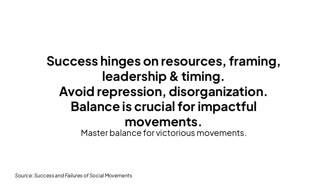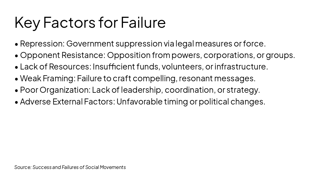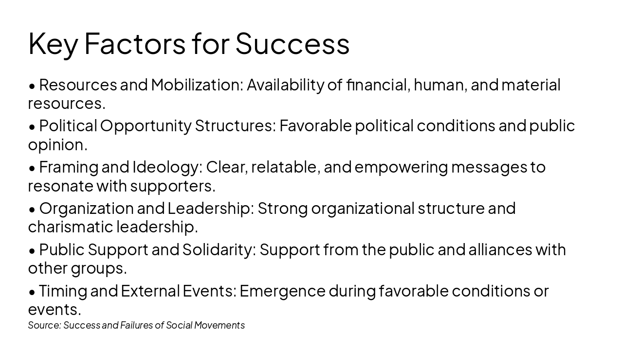 { "headers": [ "Success", "Failure" ], "rows": [ [ "Adequate Resources", "Lack of Resources" ], [ "Strong Framing", "Weak Framing" ], [ "Strong Organization", "Poor Organization" ], [ "Good Timing", "Adverse Timing" ], [ "Public Support", "Repression" ] ] }