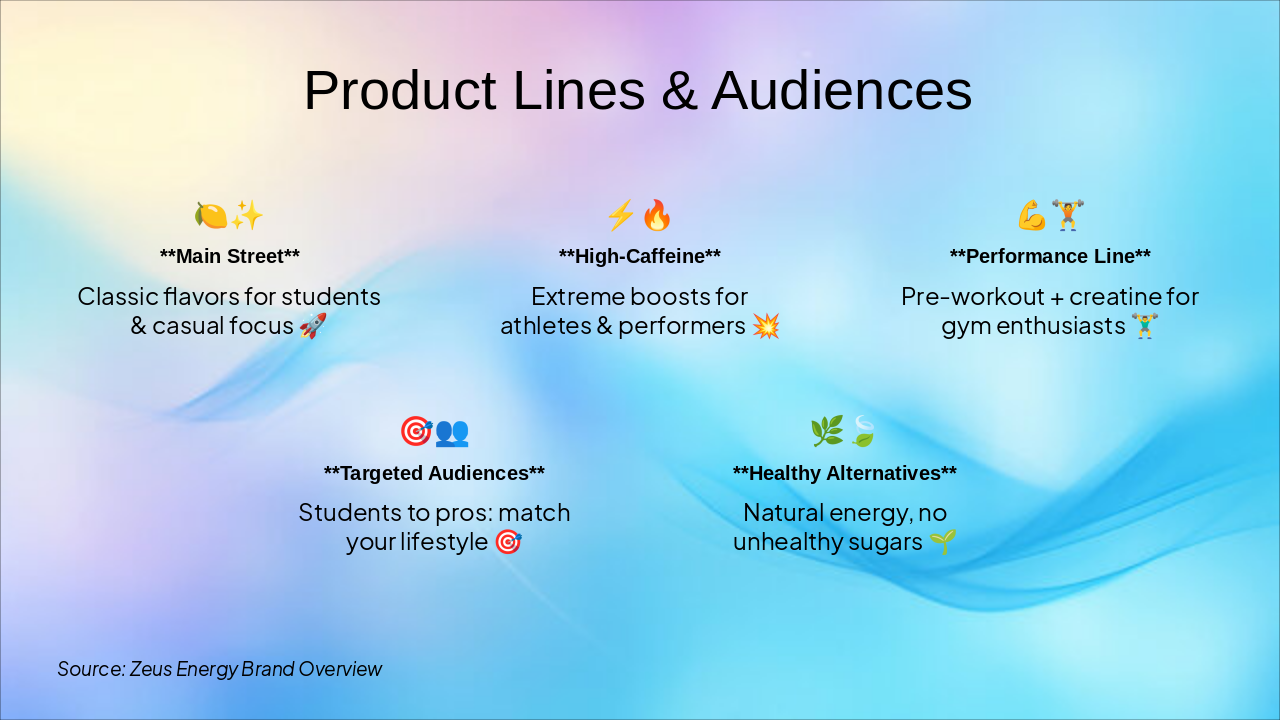 Make a presentation about: We started Zeus Energy after noticing how university students rely on unhealthy energy drinks to keep up with heavy workloads, late nights, and high stress. Our goal was to create a better alternative that supports focus and performance while promoting responsible energy use and sustainability. Logo: The Zeus Energy logo that we used has a lightning-shaped letter Z that represents the qualities of power and speed. The bold lightning creates a strong and modern look for our brands with high -energy personalities. In addition, our distinct colours are used across all our product lines to show the variety of flavors we have, all while keeping one clear brand identity. Trademark Search Summary Through searching for the name of Zeus Energy. We used public online sources and web searches, but still no identical trademarks were found in the energy drink or functional beverage category at the time of our research. This proves that our brand name is suitable for our branding purposes. Brand Owner Zeus Energy Beverages Slogan /Tagline “Fuel the Power Within.” OWNERSHIP Who is the owner(s) Abdullah, Wynn, Aidin Why have they decided to go into business: - We have decided to go into this business because we have seen many unhealthy, and not effective energy drinks fly through the market. We aim to put actual effective and performance-based energy drinks and supplements to show the world what true performance feels like. Why are they qualified, or will be qualified, to open this business - could be interests/experiences of the owner as related to this business or business in general Goals of owner as related to opening this business - The owners of Zeus Energy are very qualified to open this business due to their strong interest in fitness, health and performance and their understanding of energy drinks and supplement markets. This direct connection to the target market allows us to understand the consumers' needs and preferences. In addition, the owners have developed knowledge in both branding and marketing through independent research, and we will continue to become more qualified by gaining certifications related to food safety and business operations. We will work with industry professionals during product development as well as manufacturing processes. Type of business - sole proprietorship, partnership, corporation Advantages and disadvantages of the type of business ownership chosen - Our combined skills, ideas and experience strengthen our decision making. Role of owner/partner(s) in the business - what you and any partners will do on a day-to-day basis - Each partner at Zeus energy will play an active role in daily operations. - Products and operations manager: He will oversee manufacturing, quality control, as ingredient sourcing. - Marketing and branding manager: Manages social media, influencer partnerships, advertising campaigns, and brand image. - The sales and distribution manager develops our retail partnerships, manages online sales, and coordinates product distribution. - By dividing our responsibilities across partners, Zeus Energy will ensure efficient operations while allowing each owner to focus on his strengths to contribute to the success of the company. We would set up Zeus Energy in a general partnership with two or more partners who jointly own and operate it. In this sense, a general partnership is a business arrangement where all business partners contribute significantly to the business through capital, labor, expertise, or strategic input. Under this structure, all partners, including us, will be actively involved in managing the company. This means decisions on production, branding, distribution, finance, and business strategy would be collectively made. With management responsibility being simultaneously held by all the partners, the business would depend on our ability to communicate well, arrive at unity in decisions, and remain steadfastly committed to its success. Unlimited personal liability is one important general partnership characteristic. This means that each partner is fully responsible for the obligations, debts, and legal exposures of the business. This includes being responsible for our own actions and for the actions of other partners. If one partner incurs debt or enters an agreement on behalf of the business, all partners are equally responsible. This requires the partners to have an elevated level of mutual trust and for all to act with discipline and accountability. This structure has several advantages despite the risk level. We pool our skills, networks, and resources to let Zeus Energy speed up development. We can share some costs and workload in starting up, improving the company's overall operational strength due to the broader range of expertise. A general partnership is also comparatively easy to set up with fewer legal and administrative requirements than a corporation. ──────────────────────────── SECTION 2 – INTRODUCTION & BRAND OVERVIEW Brand vision and values: Product Line Breakdown: - Main Street Line: Classic, Everyday Flavors - High-Caffeine Line: Extreme Energy - Performance Line: Pre-Workout, Creatine and Protein Blends Target Audiences - Main Street Line: Casual Users, Students, Gym - High-Caffeine Line: Extreme Enthusiasts, High-Performance Seekers, Athletes - Performance Line: Athletes, Gym people, and fitness people. Design and Aesthetic - Color Schemes & Visual Identity - Custom Typography & Iconography Conclusion - Zeus energy is committed to delivering high -performance energy products that support a wide variety of users, from regular consumers to serious athletes. The brand stands out through its focus on quality and its purpose driven formulas, ensuring each product delivers the best highest benefit. ──────────────────────────── SECTION 3 – PRODUCT LINES, TARGET AUDIENCES & DES