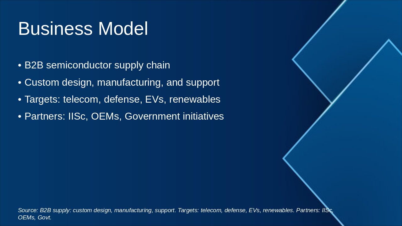 B2B semiconductor supply; custom design, manufacturing, technical support. Target industries: telecom, defense, EVs, renewables. Partnerships with IISc, OEMs, and Govt initiatives.
