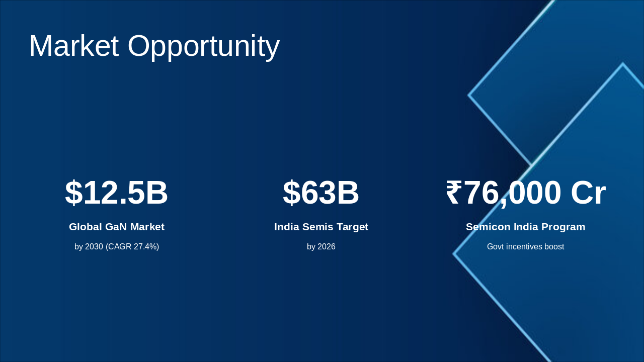 $12.5B global GaN market by 2030 (CAGR 27.4%). India’s $63B semiconductor target by 2026. ₹76,000 Cr Semicon India Program. Government incentives and deep-tech adoption.