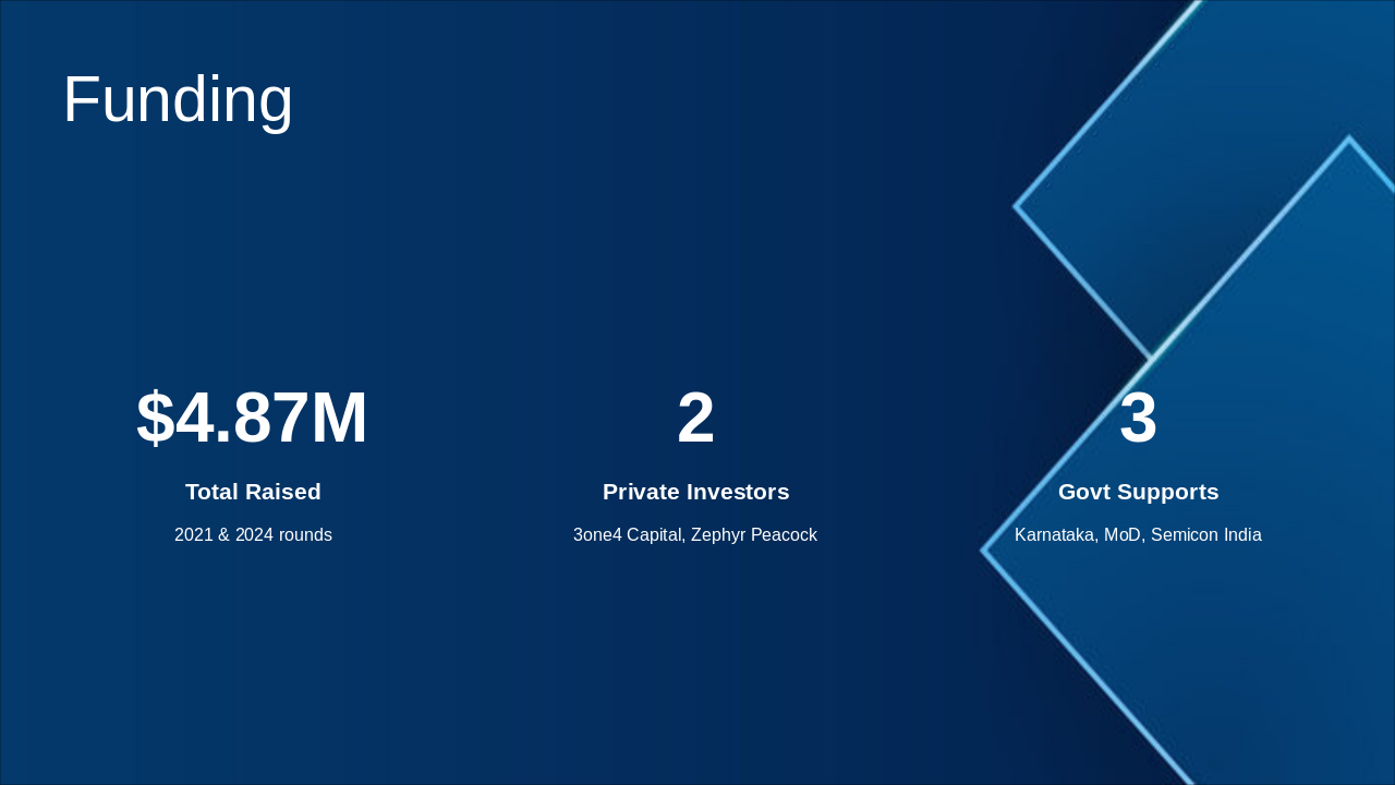 Total $4.87M raised across two rounds (2021, 2024). Investors: 3one4 Capital, Zephyr Peacock. Govt support: Karnataka Govt, Ministry of Defence, Semicon India Program.