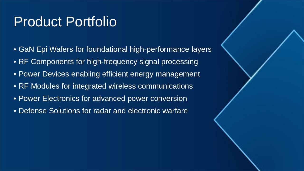 GaN epi wafers, RF components, power devices, RF modules, power electronics, defense solutions.