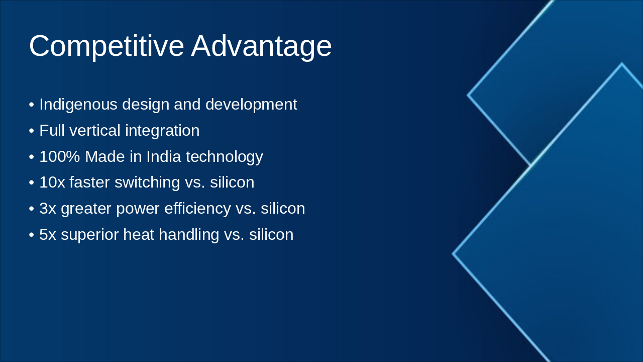 Indigenous design, vertical integration, 100% Made in India technology. 10x faster switching, 3x power efficiency, 5x better heat handling vs. silicon.