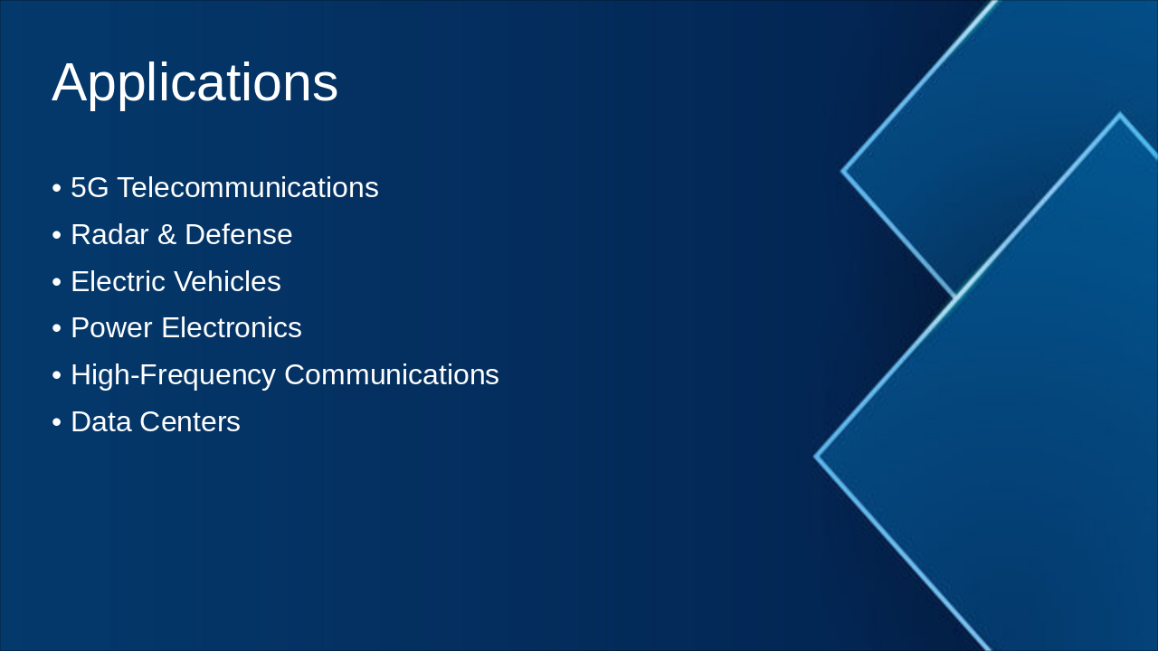 5G telecom, radar & defense, electric vehicles, power electronics, high-frequency communications, data centers.