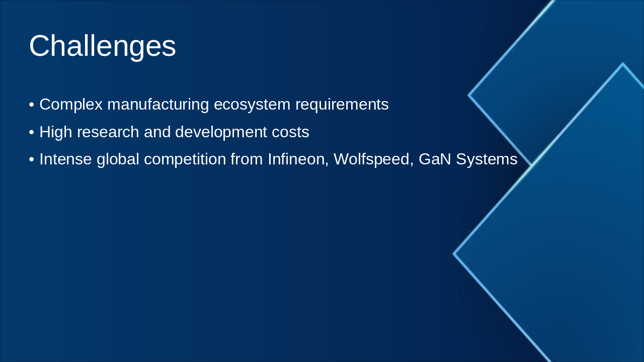 Complex manufacturing ecosystem, high R&D costs, competition from global players (Infineon, Wolfspeed, GaN Systems).