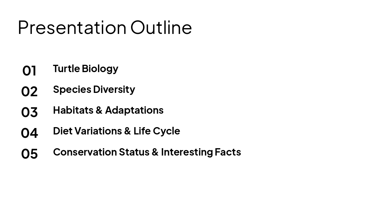 The "Interesting Facts" slide features a grid of five turtle highlights: Jonathan the tortoise at 188 years old, shells formed from fused ribs, months without food via slow metabolism, 10,000 km migrations by sea turtles, and navigation using Earth's magnetic fields.