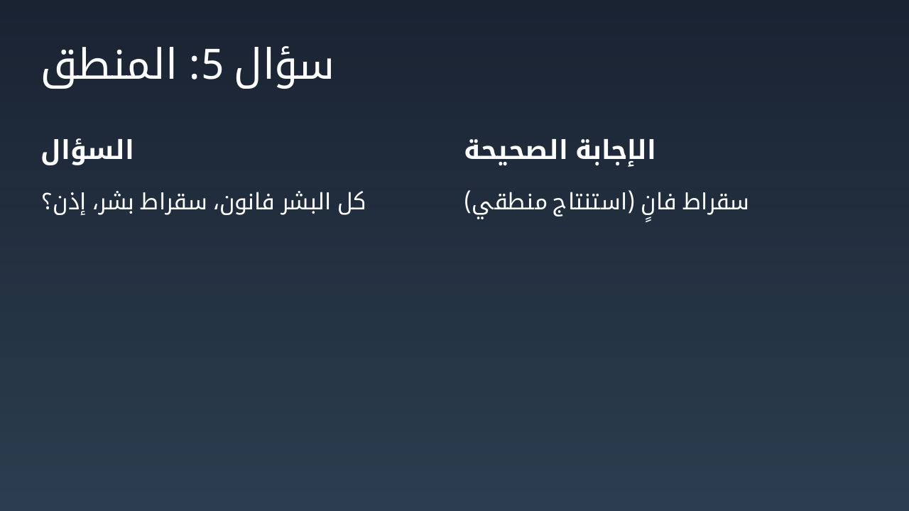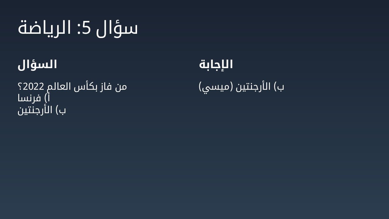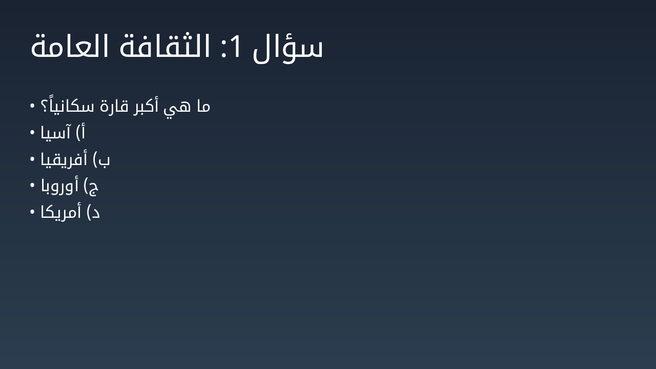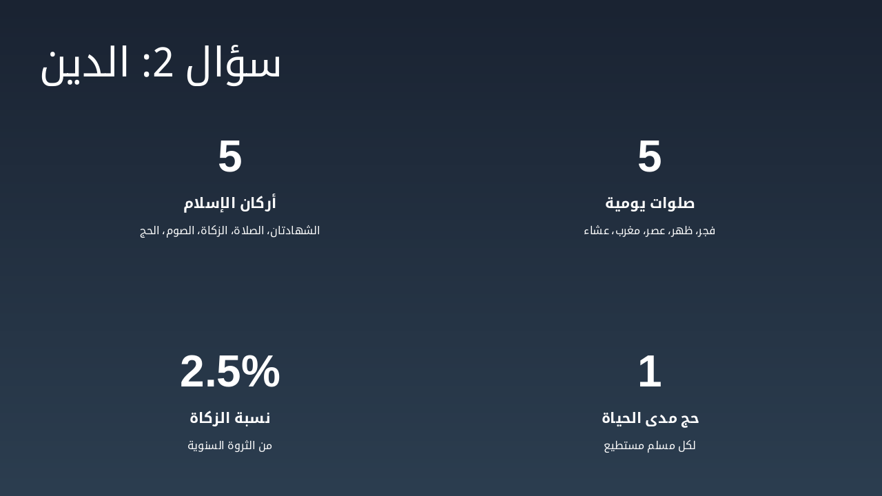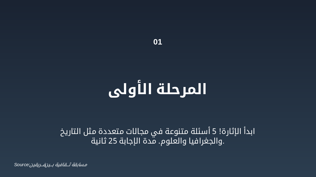 مرحلتان تحتوي كل منهما على 5 أسئلة متنوعة في مجالات: تاريخ، جغرافيا، علوم، أدب، رياضة، ثقافة عامة، دين، مخترعين، عربية، منطق.